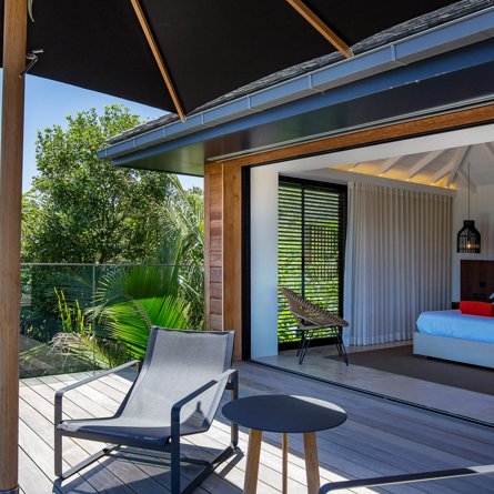 Garden view, Private terrace, Air conditioning, Queen size bed, Closet, TV, Smart TV, Apple TV, Sound system, Black out curtains and Safe.