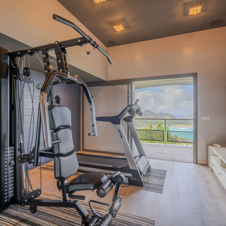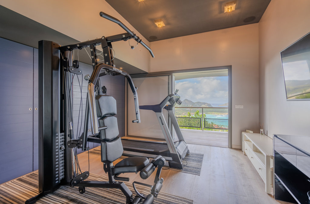 Air conditioning, TV, Treadmill, Weight bench, Weights, Jump ropes.