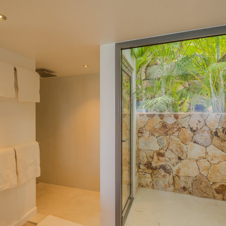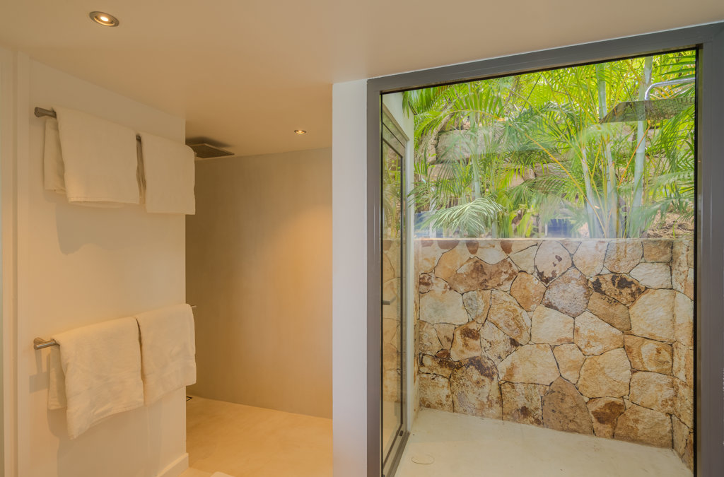 Ensuite bathroom, Walk-in shower, Outside shower, Sink, Hair dryer, Toilet.