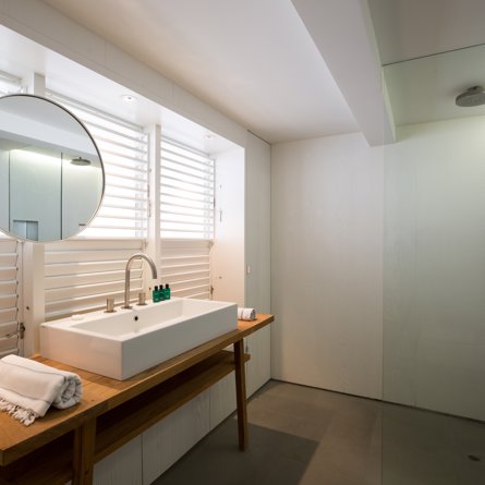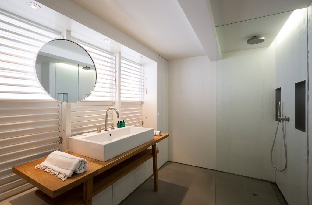 Ensuite bathroom, Walk-in shower, Sink, Open toilet.