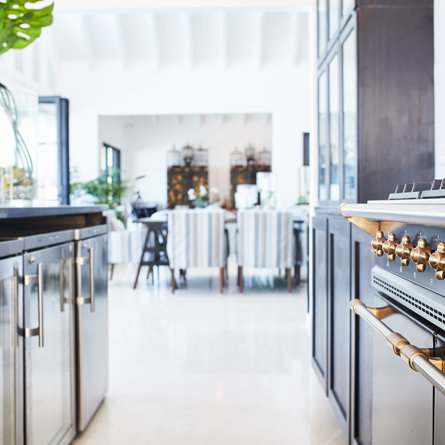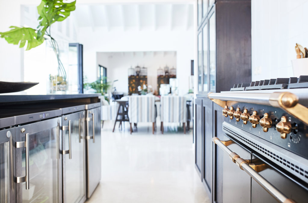 Coffee machine, Nespresso machine, Milk foamer, Kettle, Fridge, Gas stove, Oven, Blender, Citrus press, Toaster, Dishwasher.