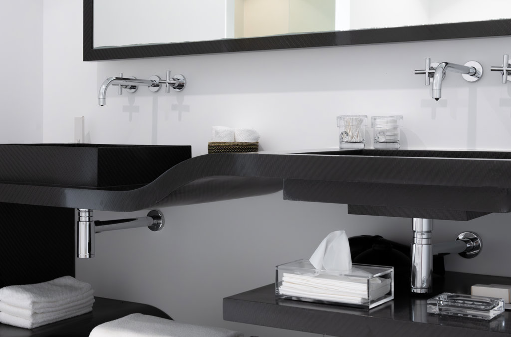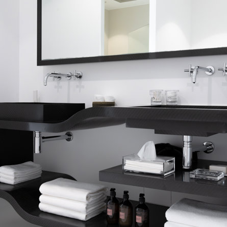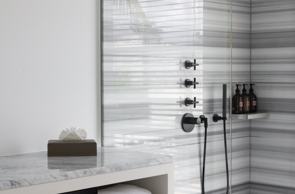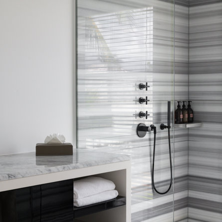 Ensuite bathroom, Walk-in shower, Two sinks, Closed toilet.