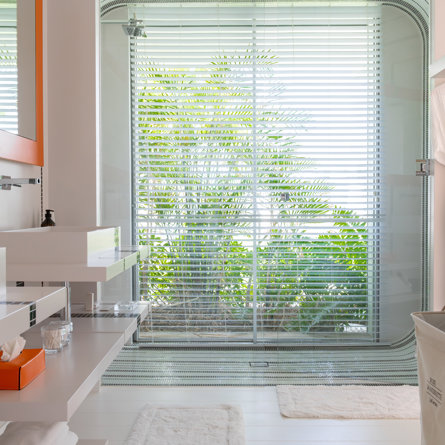 Ensuite bathroom, Walk-in shower, Two sinks, Opened toilet.