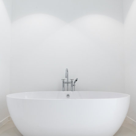 Ensuite bathroom, Walk-in shower, Bathtub, Two sinks, Closed toilet.