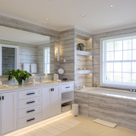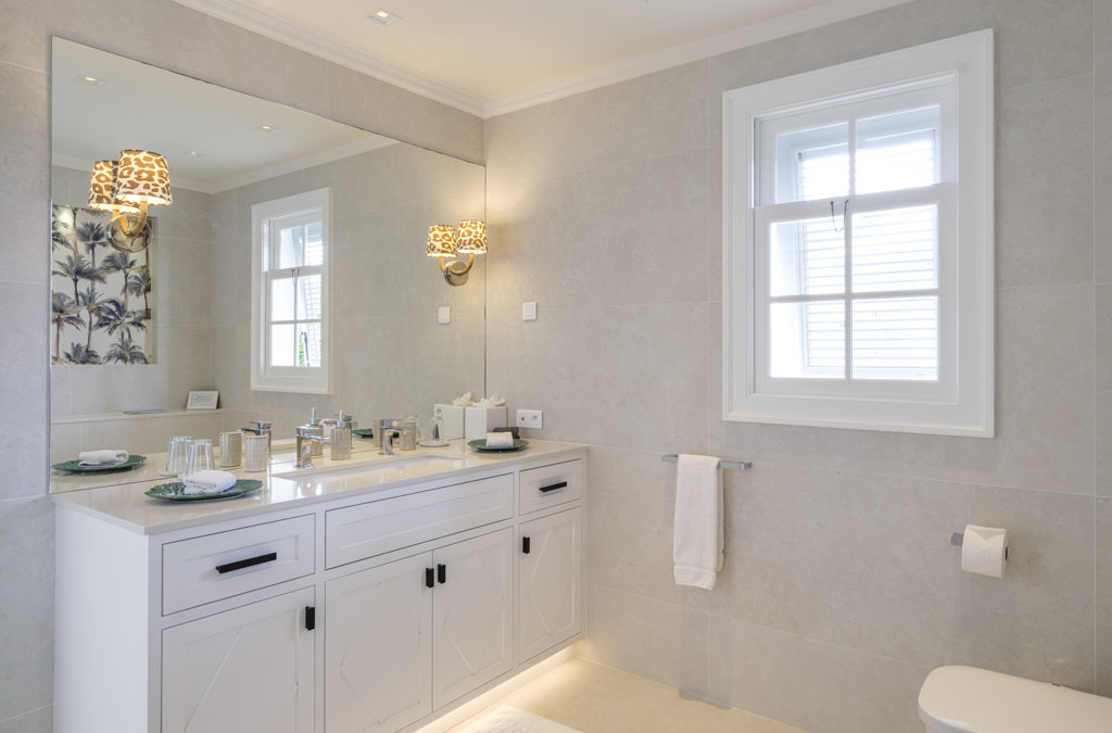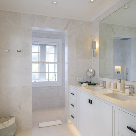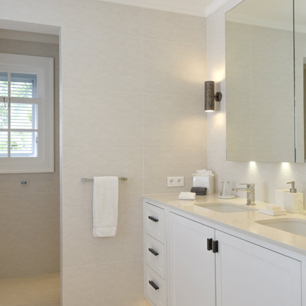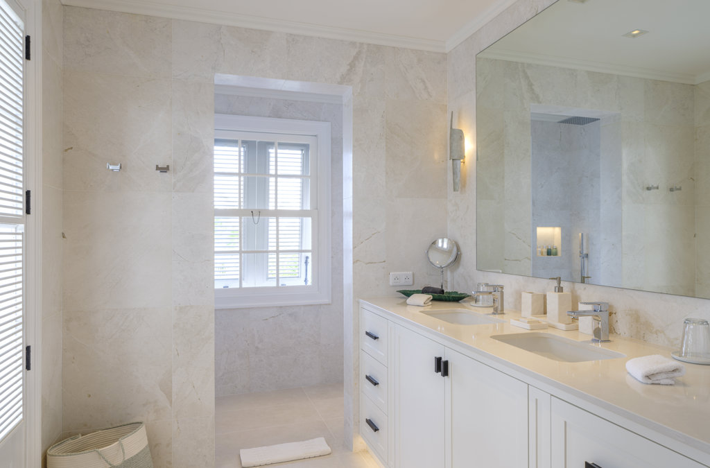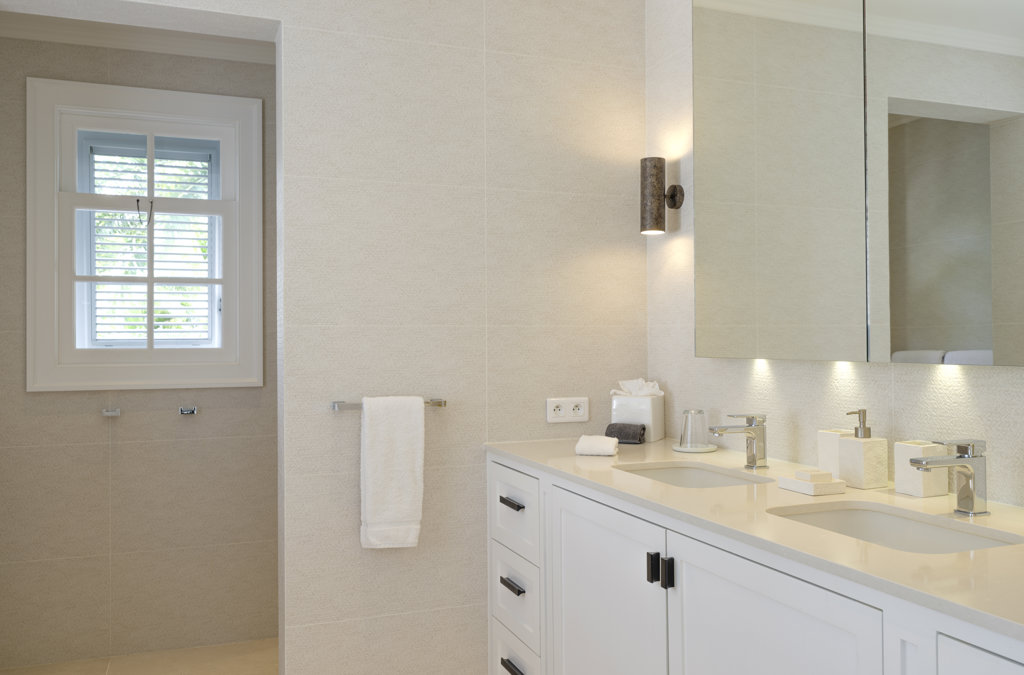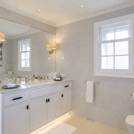 Ensuite bathroom, Walk-in shower, Two sinks, Hair dryer, Toilet.