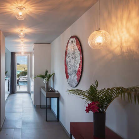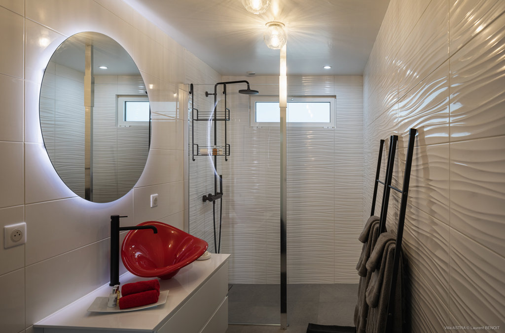 The Villa’s design is contemporary chic, playing on the astra-star theme. There’s starlight designer lighting and images of iconic movie stars throughout the home, guests enjoy star spotting as they experience Villa Astra’s “Glamor in Galaxies of Stars,” and comfortable stylish designer custom interiors.