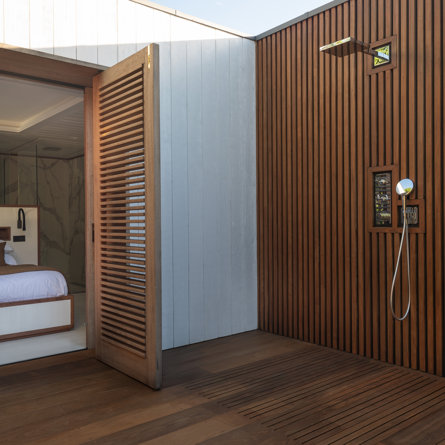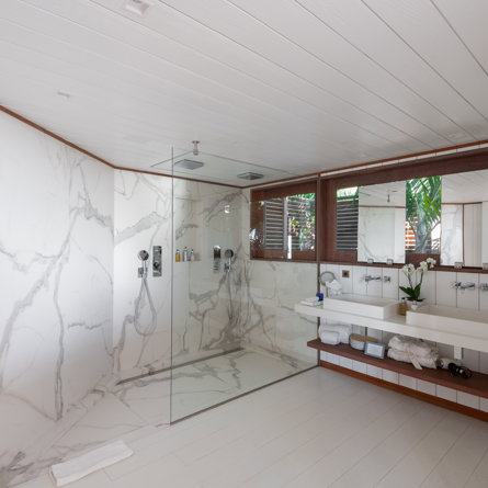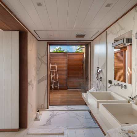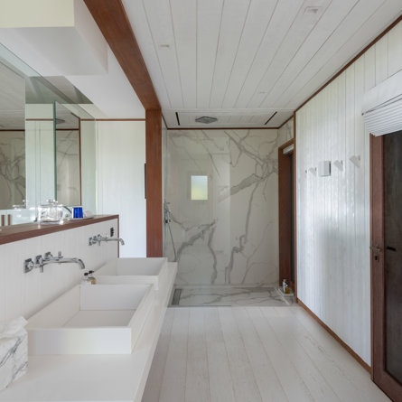 Open bathroom, Walk-in shower, Outside shower, Two sinks, Toilet.