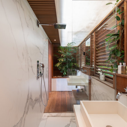 Ensuite bathroom, Walk-in shower, Outside shower, Two sinks, Toilet.