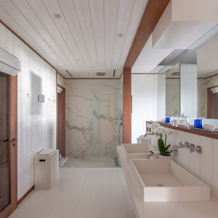 Open bathroom, Walk-in shower, Two sinks, Toilet.