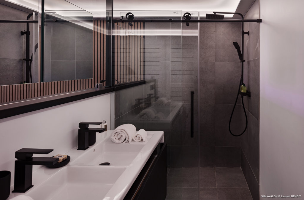 Open bathroom, Walk-in shower, Two sinks, Hair dryer, Separate toilet.