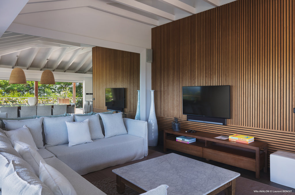 Sea & mountain view, Sofa, Dining table, TV, Apple TV, Satellite, Sound system.