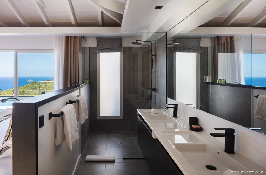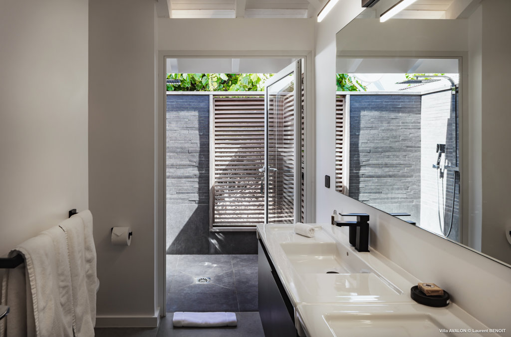 Ensuite bathroom, Outside shower, Two sinks, Hair dryer, Toilet.