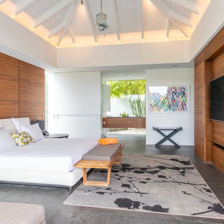 Featuring modern décor and a tranquil private garden, Villa Bakea is a spacious choice for couples and friends thanks to its three downstairs bedrooms, including one downstairs primary, plus an additional upstairs primary bedroom with a sea view, as well as plenty of common areas for cocktail hours in the refreshing breeze with views overlooking Anse des Cayes.
