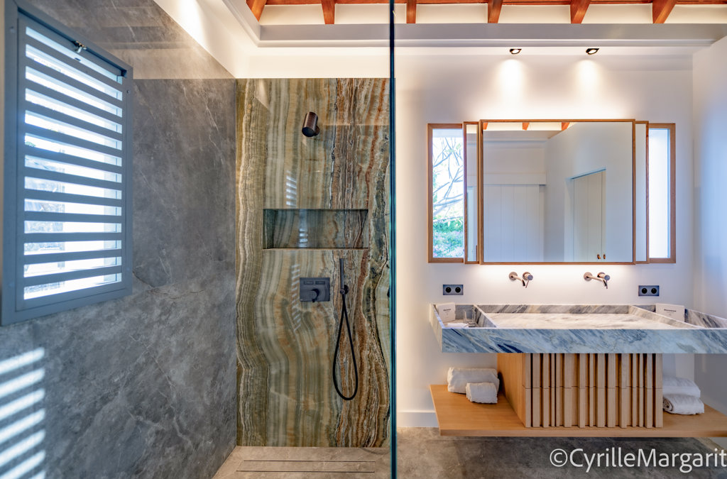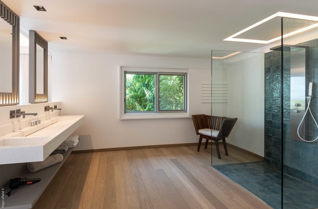 Ensuite bathroom, Walk-in shower, Two sinks, Hair dryer, Open toilet.
