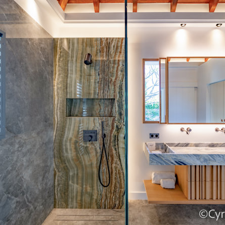 Ensuite bathroom, Walk-in shower, Two sinks, Hair dryer, Close toilet.