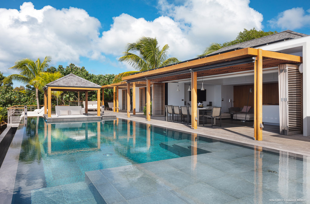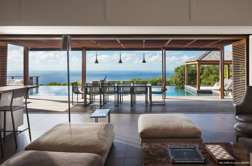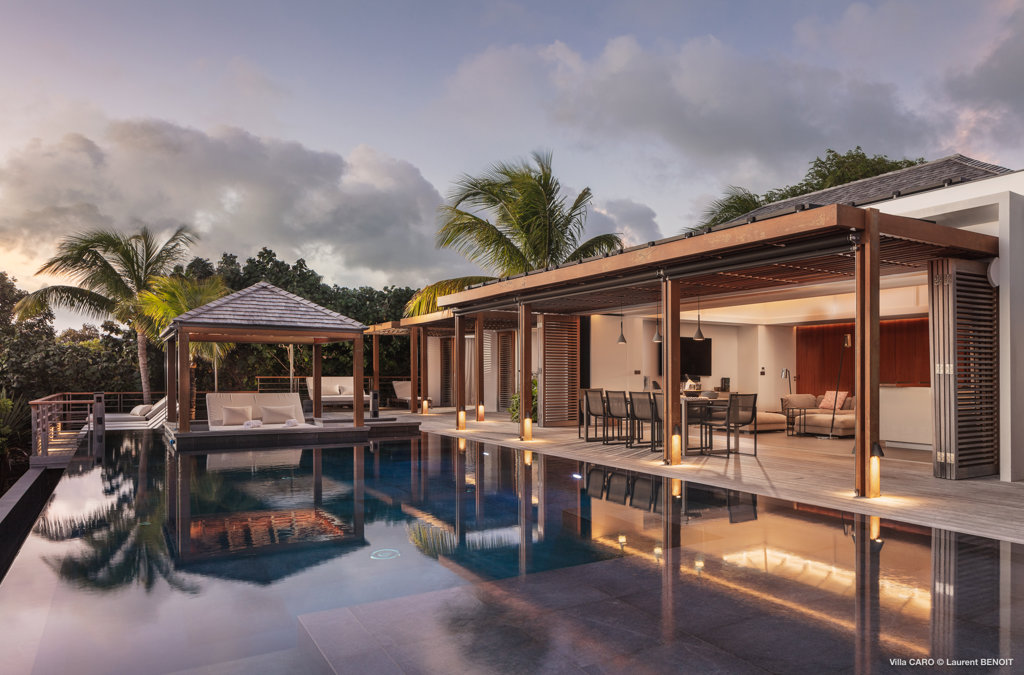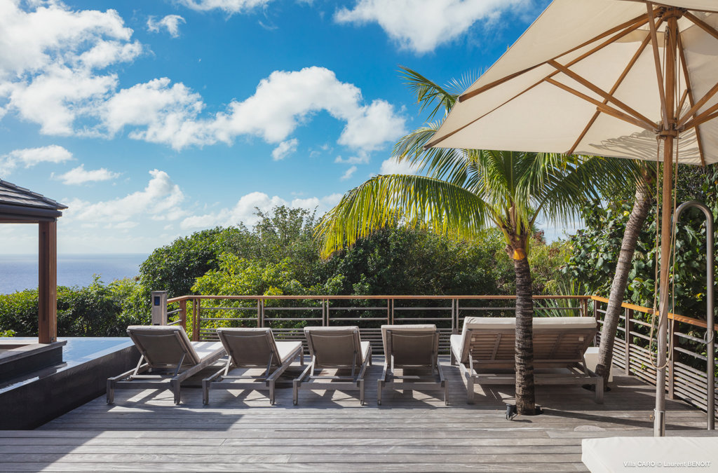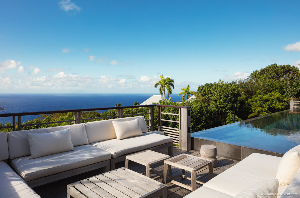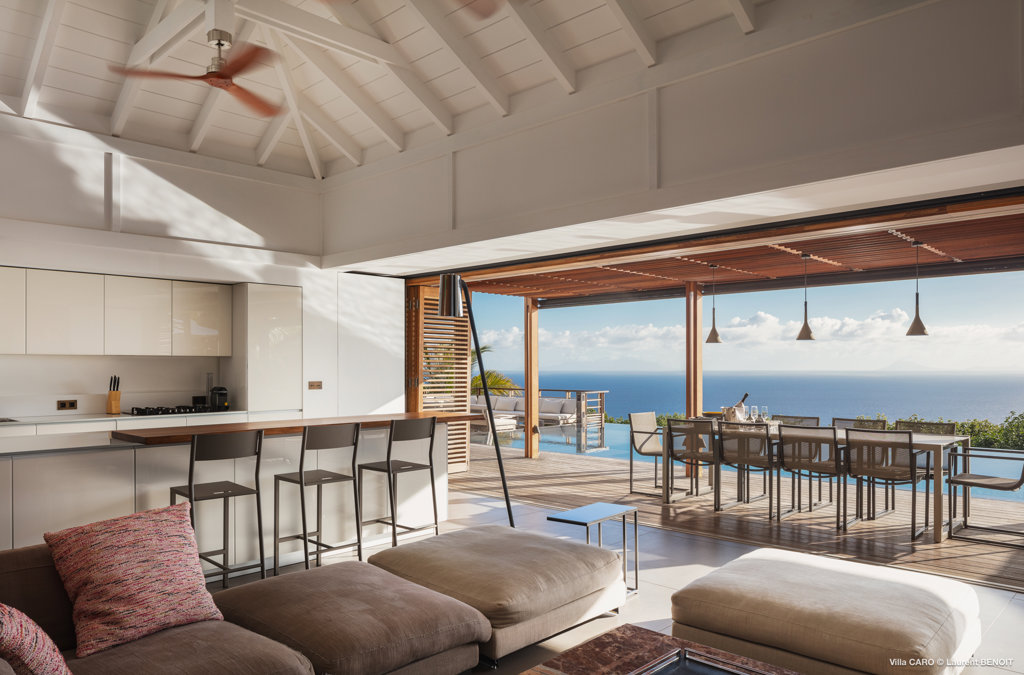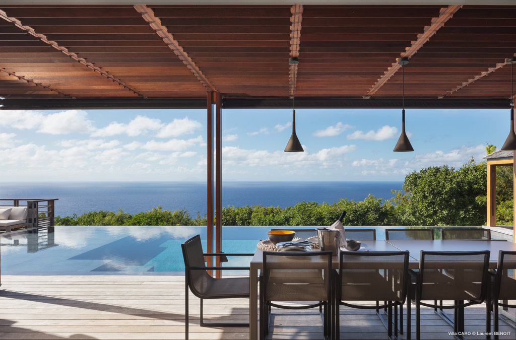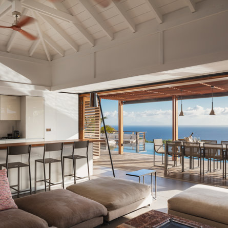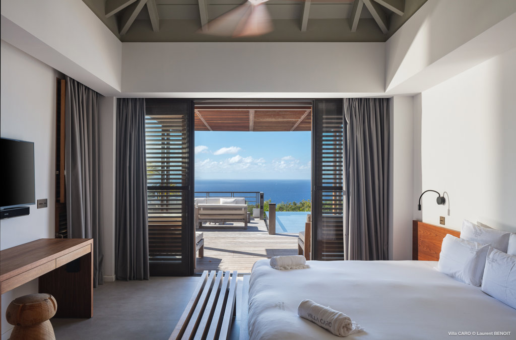 Villa Caro is a prime year-round destination for family or friends, offering a single-floor plan with five equal-size bedrooms — three in the front and two in the back — with rich, woody toned accents, as well as gorgeous winter sunsets and a beautiful view over the ultra-popular Gouverneur quartier.