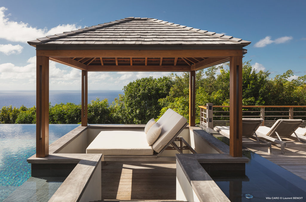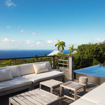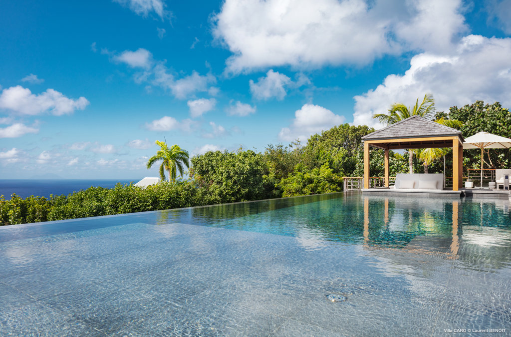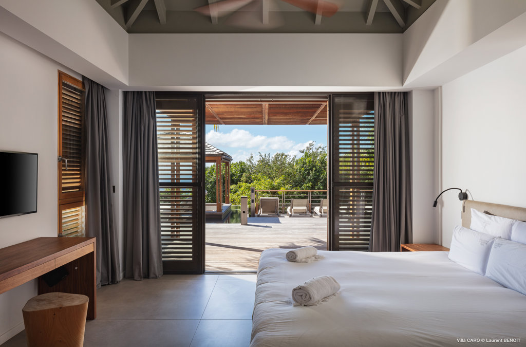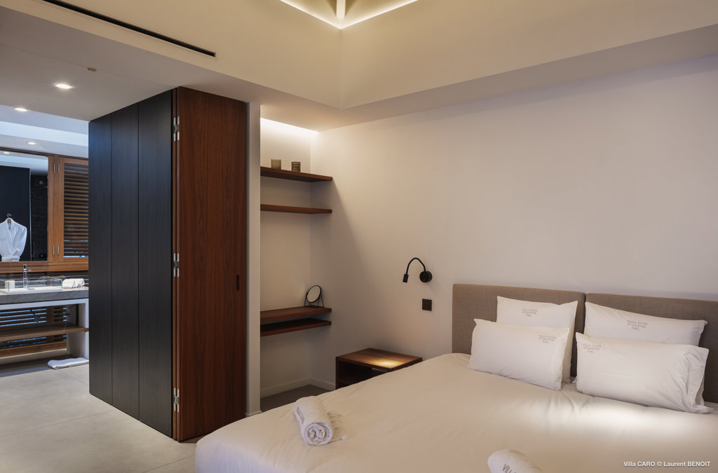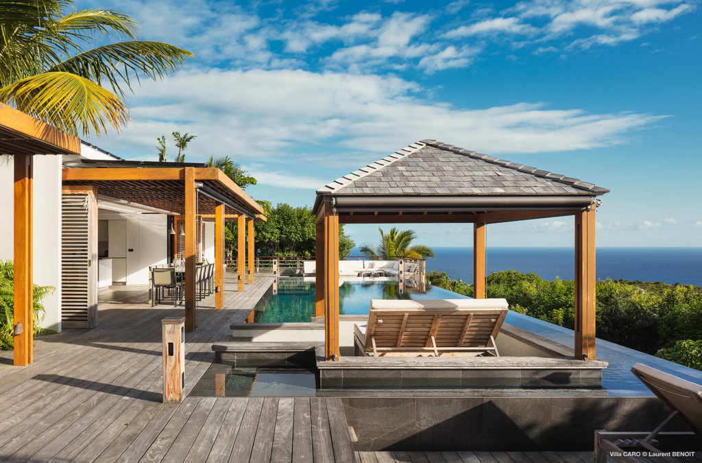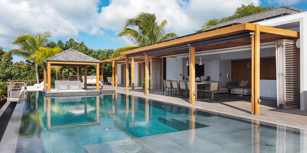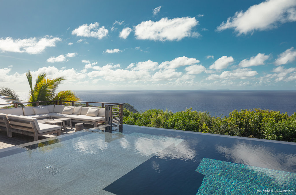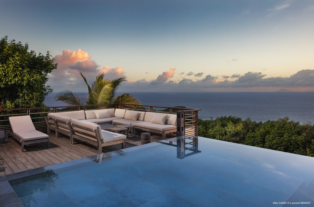 Villa Caro is a prime year-round destination for family or friends, offering a single-floor plan with five equal-size bedrooms — three in the front and two in the back — with rich, woody toned accents, as well as gorgeous winter sunsets and a beautiful view over the ultra-popular Gouverneur quartier.