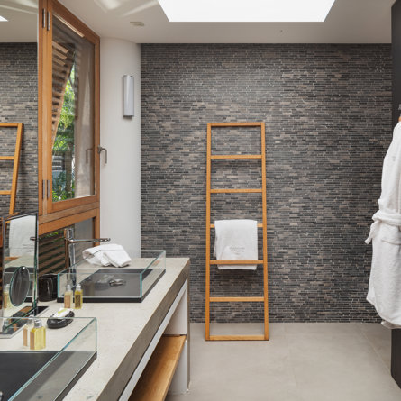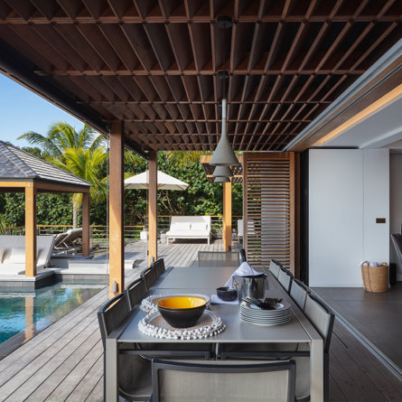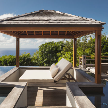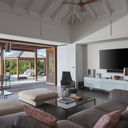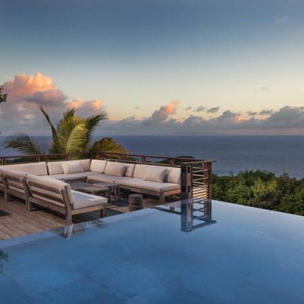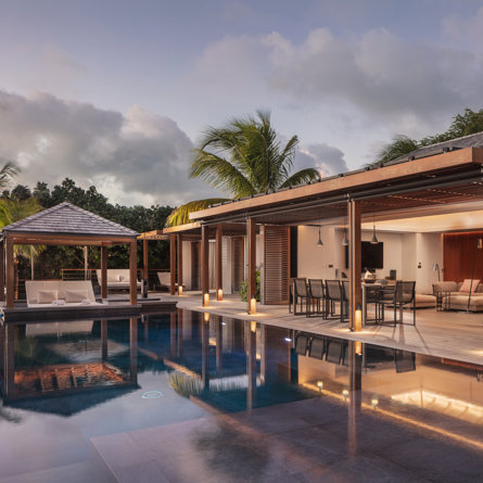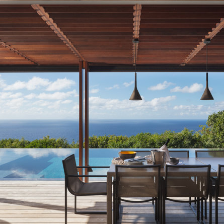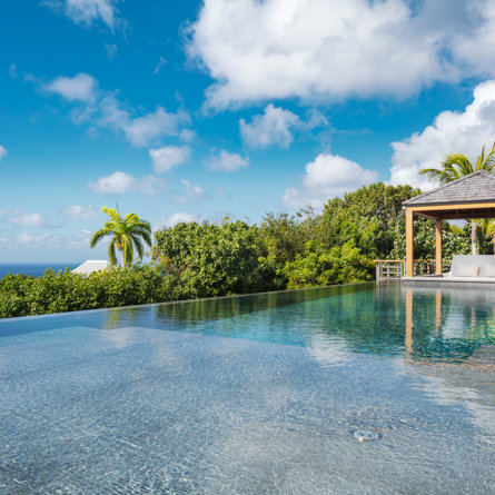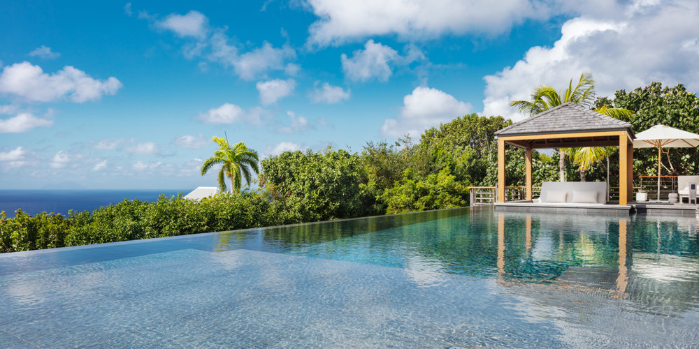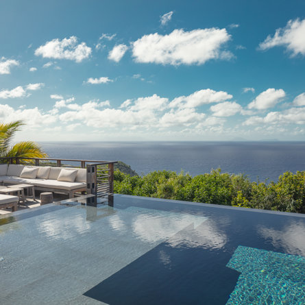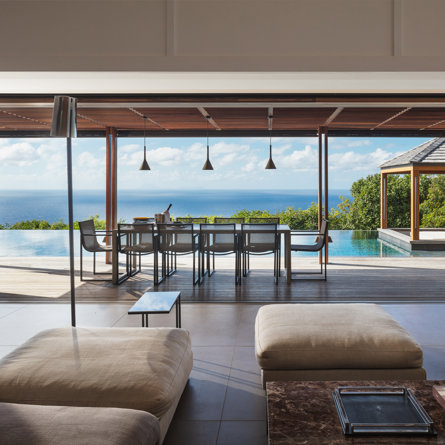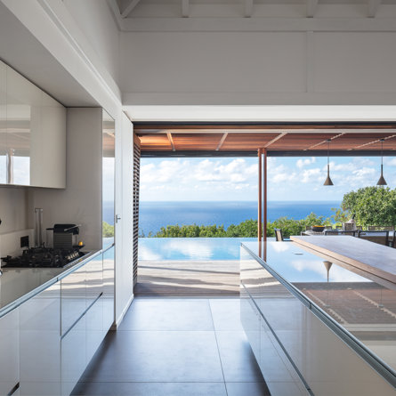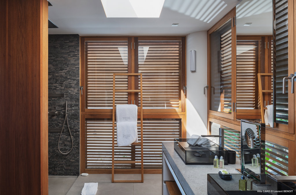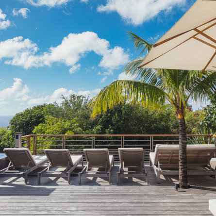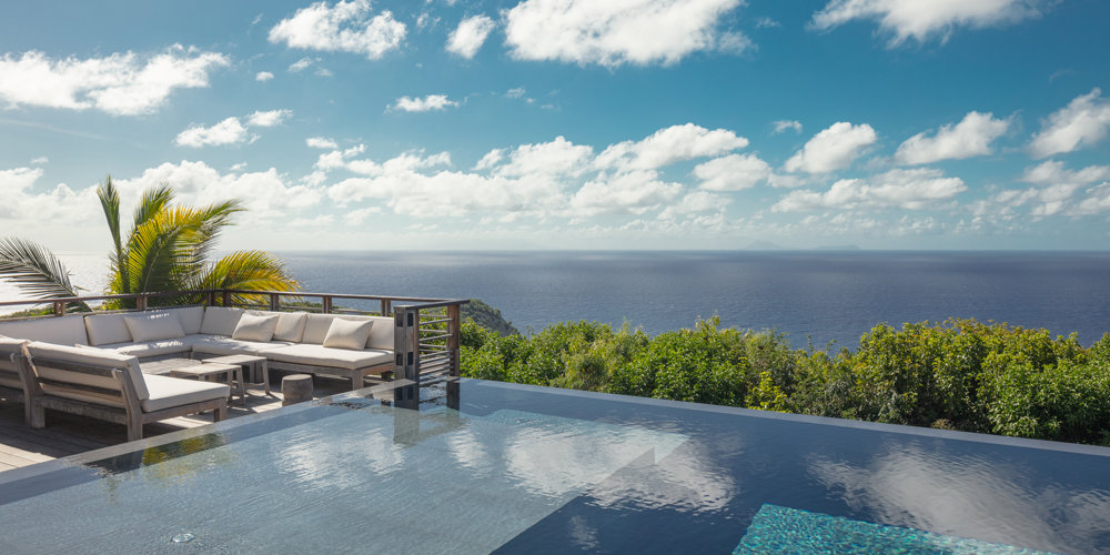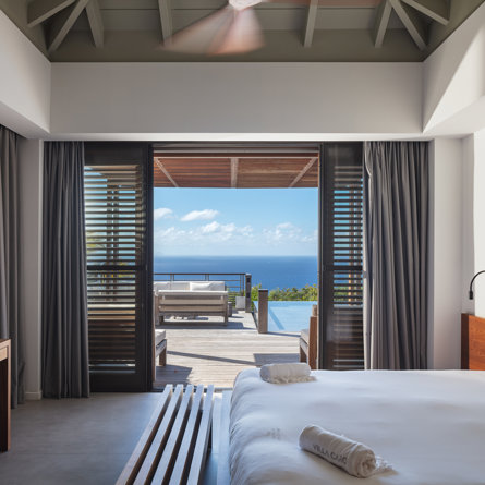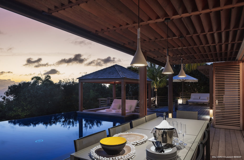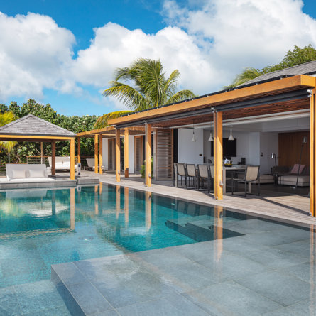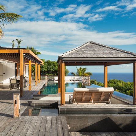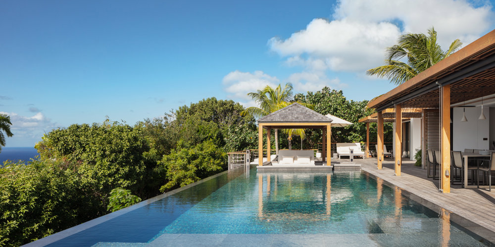Villa Caro is a prime year-round destination for family or friends, offering a single-floor plan with five equal-size bedrooms — three in the front and two in the back — with rich, woody toned accents, as well as gorgeous winter sunsets and a beautiful view over the ultra-popular Gouverneur quartier.