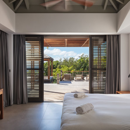 Sea view, Terrace, Air conditioning, Fan, King size bed, Walk-in closet, Desk, TV, Dish, Black out curtains, Mosquito screen and Safe.