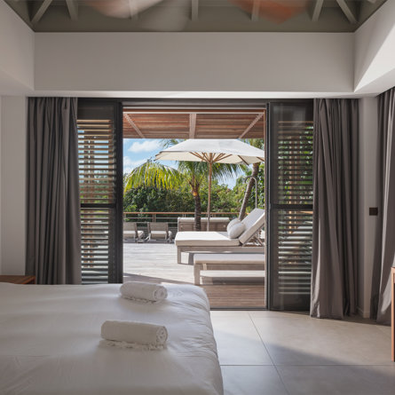 Garden view, Private Terrace, Air conditioning, Fan, King size bed, Closet, Desk, TV, Dish, Black out curtains, Mosquito screen and Safe.