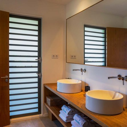Ensuite bathroom, Walk-in shower, Outside shower, Two sinks, Hair dryer, Close toilet.
