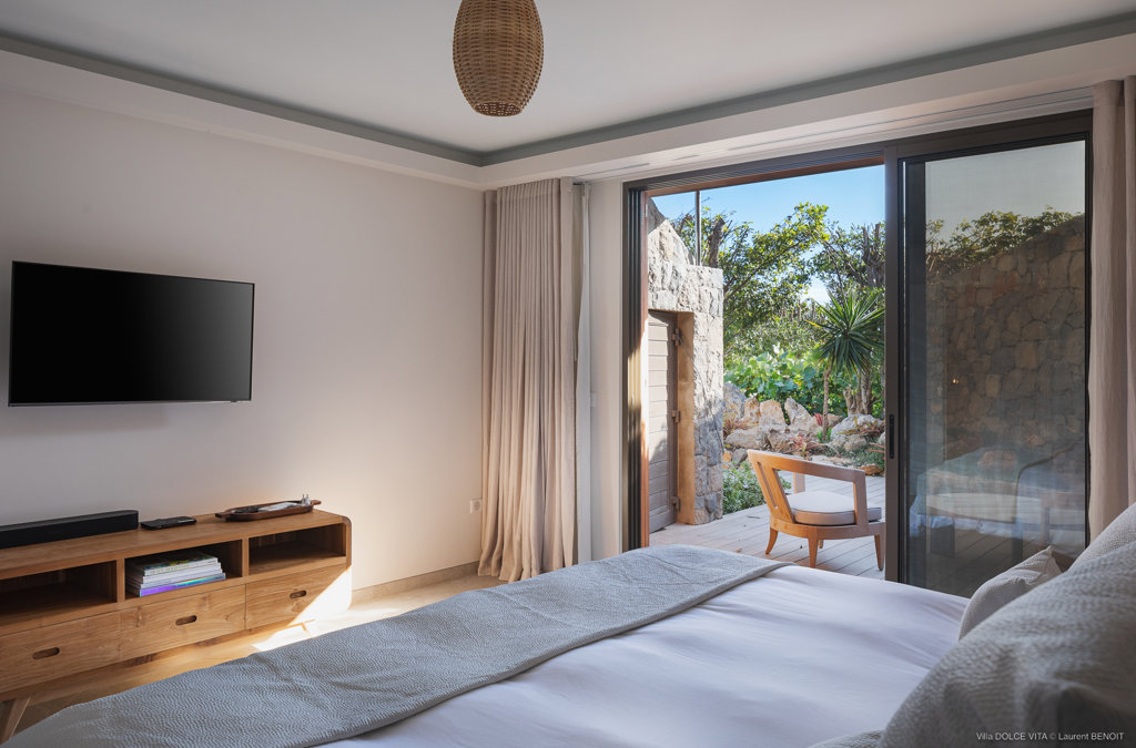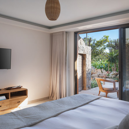 Garden view, Private Terrace, Air conditioning, King size bed, Walk-in closet, TV, Smart TV, Dish, Apple TV, Sound system, Black out curtains, Mosquito screen, Safe.