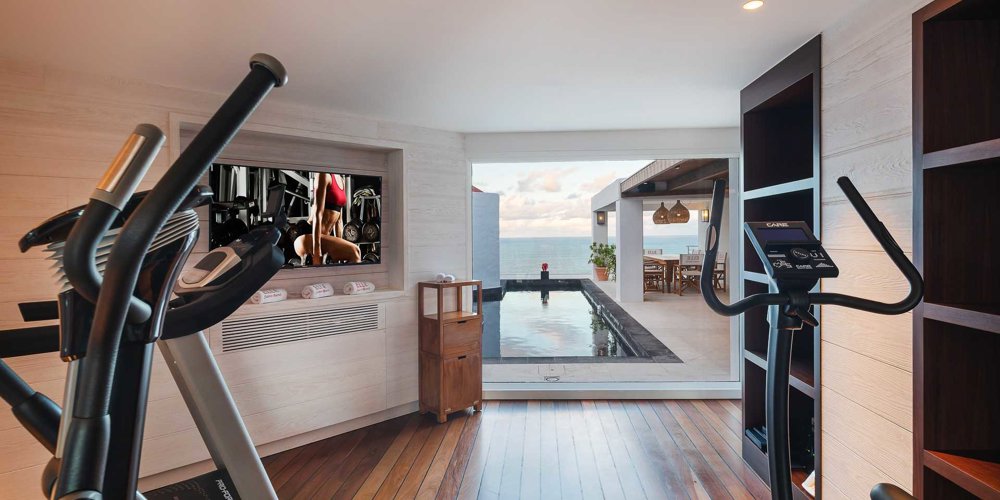 Air conditioning, TV, Treadmill, Elliptical bike, Indoor bike and Weights.