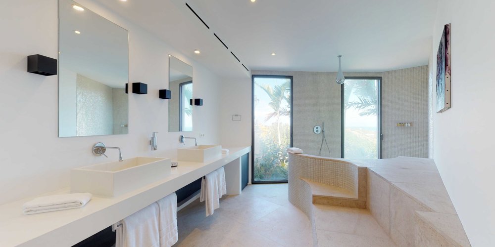 Ensuite bathroom, Shower, Walk-in shower, Two sinks, Hair dryer, Open toilet.