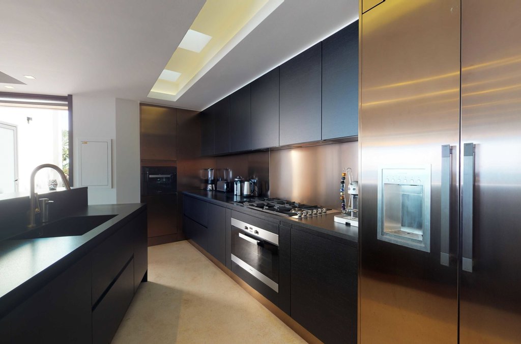 Air conditioning, Coffee machine, Nespresso machine, Milk foamer, Kettle, Fridge, Wine cellar, Ice machine, Electric cooker, Oven, Microwave, Kitchen Aid, Toaster, Dishwasher, Dining table, Bar.