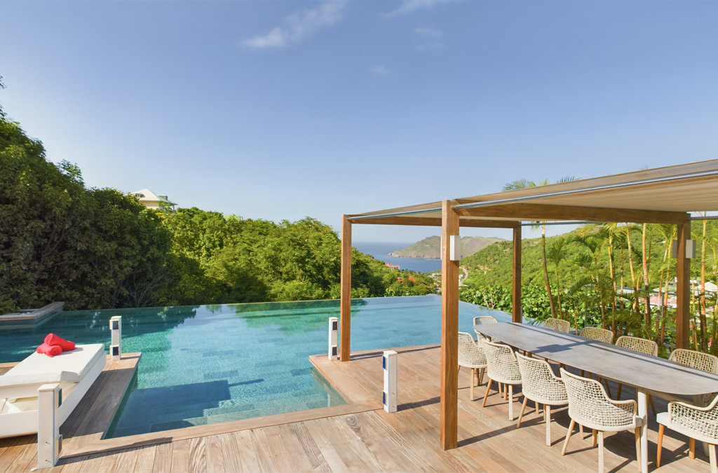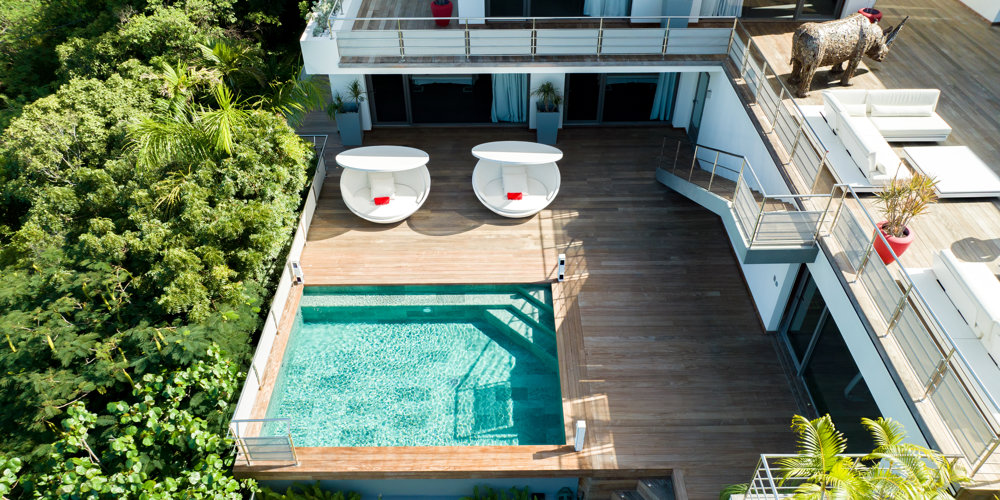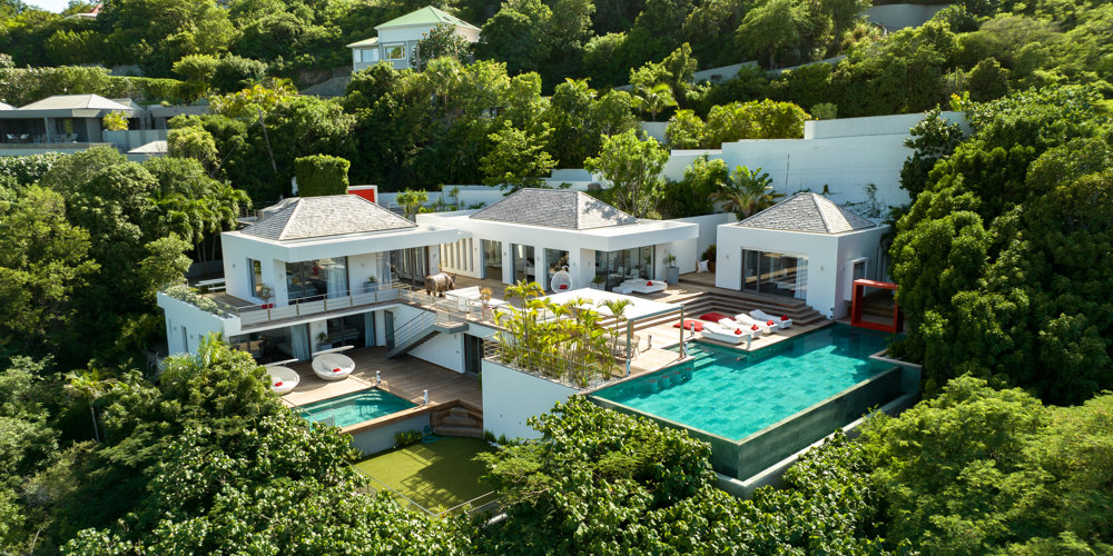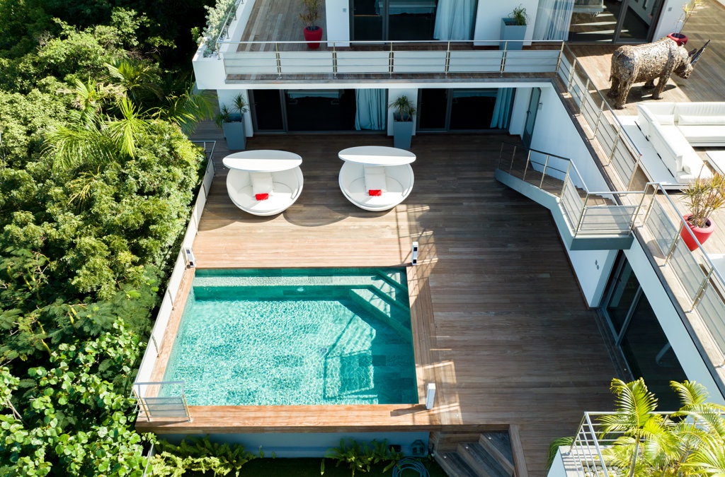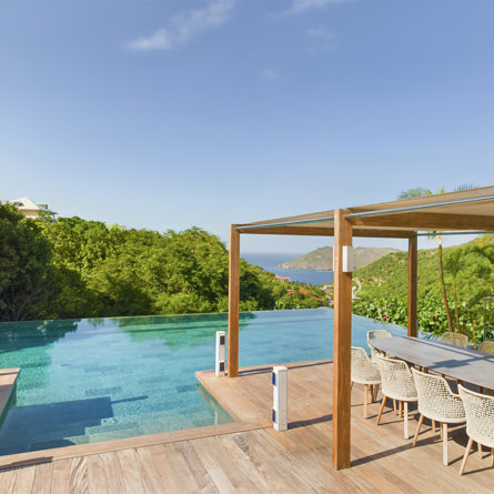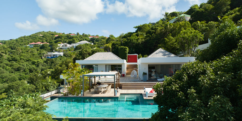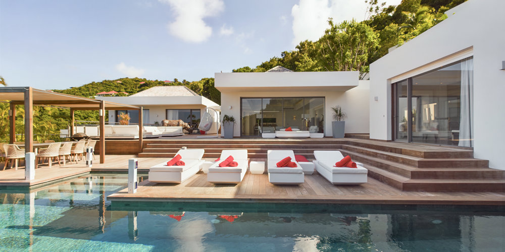 Villa Eternity is a modern home with two levels accessed by stairs, located in Flamands and terrific for a large group of friends or family with teenagers, offering spacious bedrooms, a gym and a partial sea view.