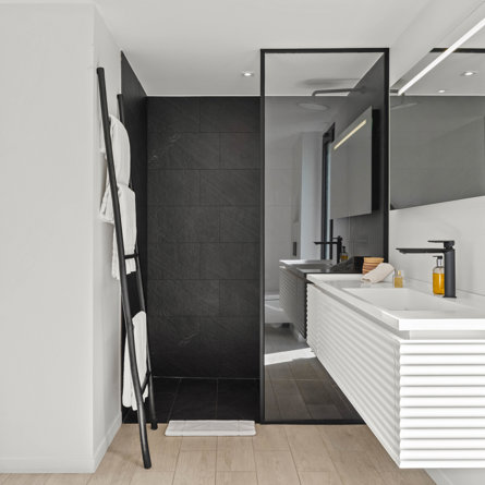 Ensuite open bathroom, Walk-in shower, Sink, Hair dryer, Toilet.