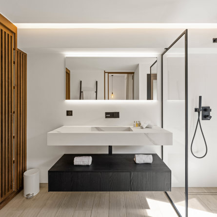 Ensuite open bathroom, Walk-in shower, Sink, Hair dryer, Toilet.