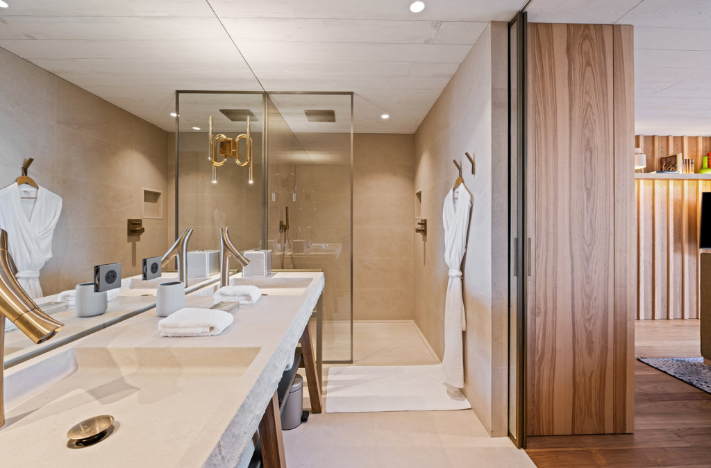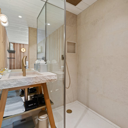 Open bathroom, Walk-in shower, Sink, Separate toilet.