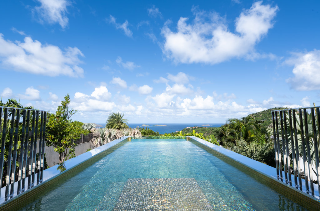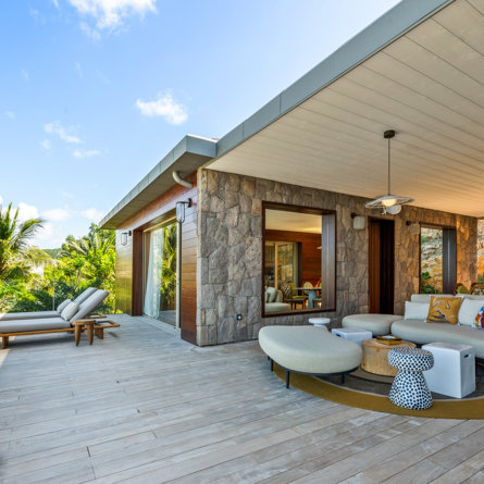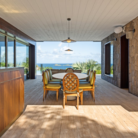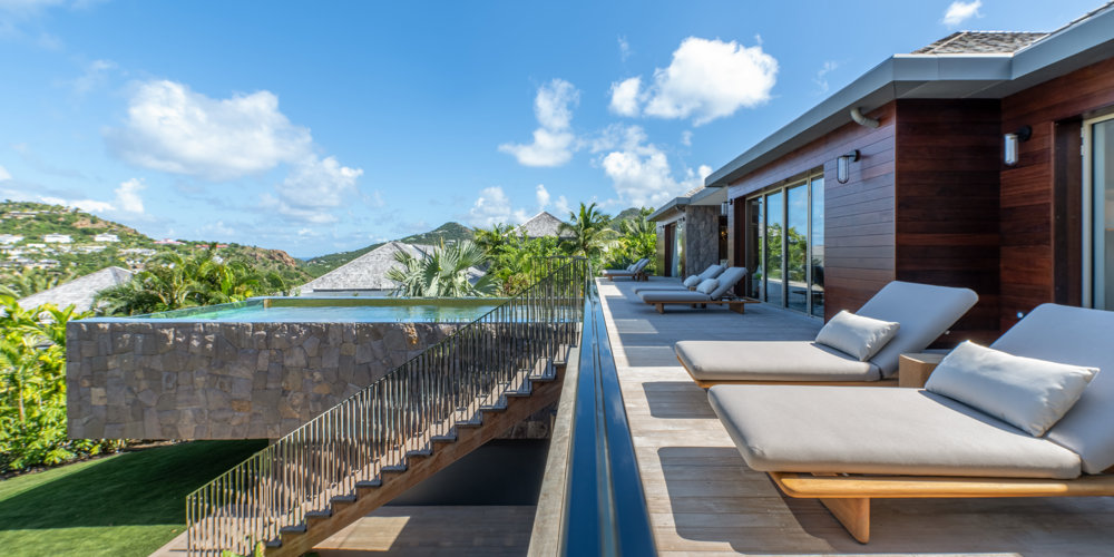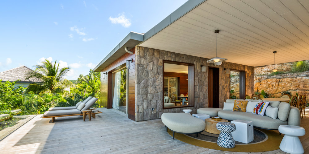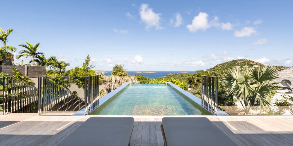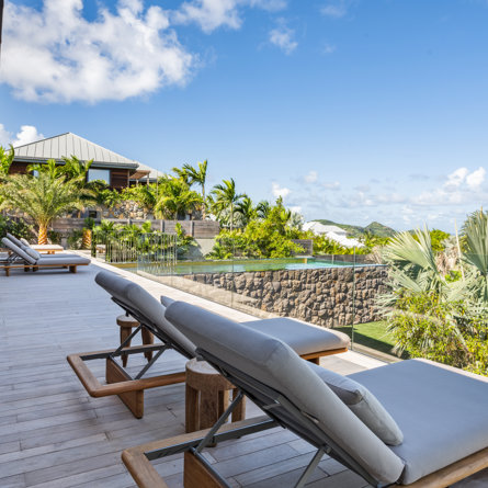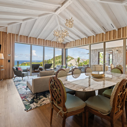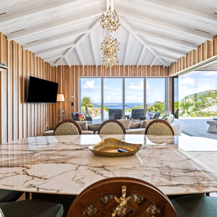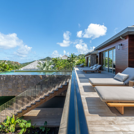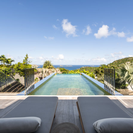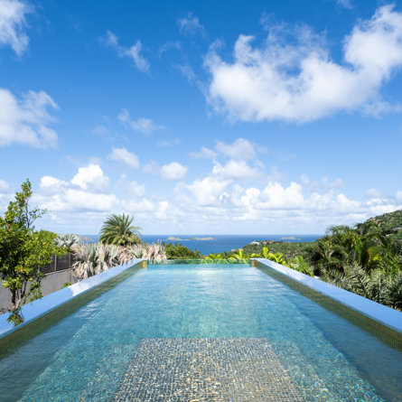 Overlooking the sparkling St Jean Bay, Villa Golden Eye is a stunning, fully air-conditioned home defined by its original design features and chef’s kitchen. Two spacious bedrooms and a kids' room on the main level offer privacy while the primary bedroom on the ground level opens onto its own private terrace with jacuzzi. The remarkable pool lined in mosaic tiles boasts a transparent side facing the sea for an elevated swimming experience.
