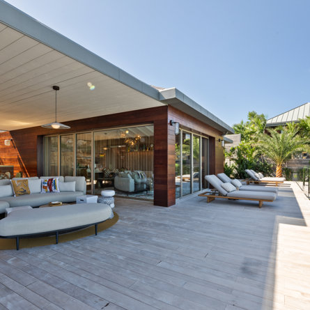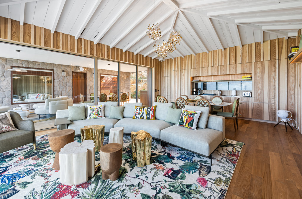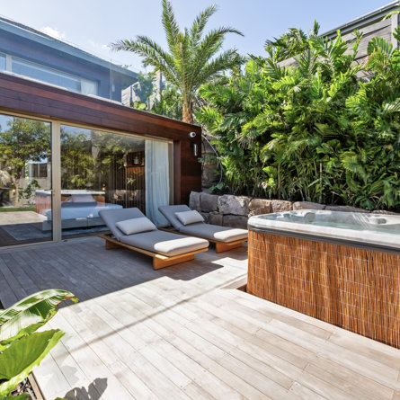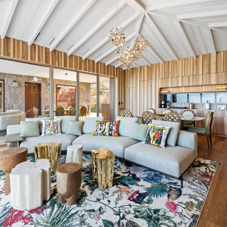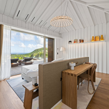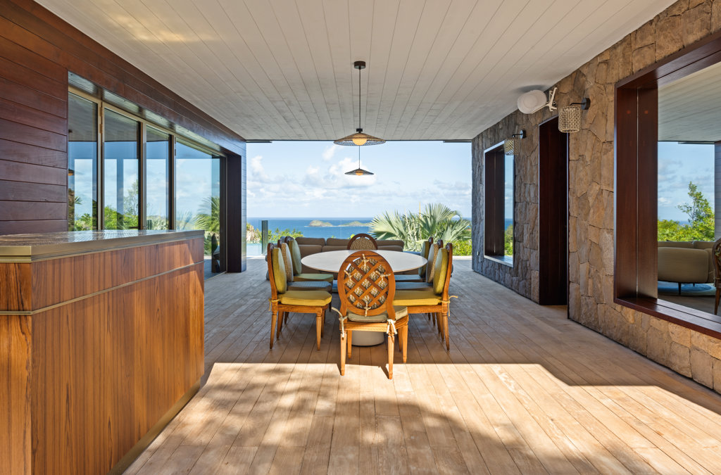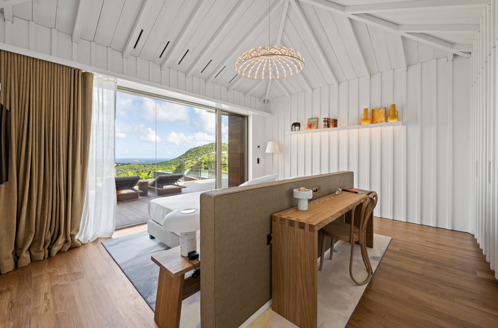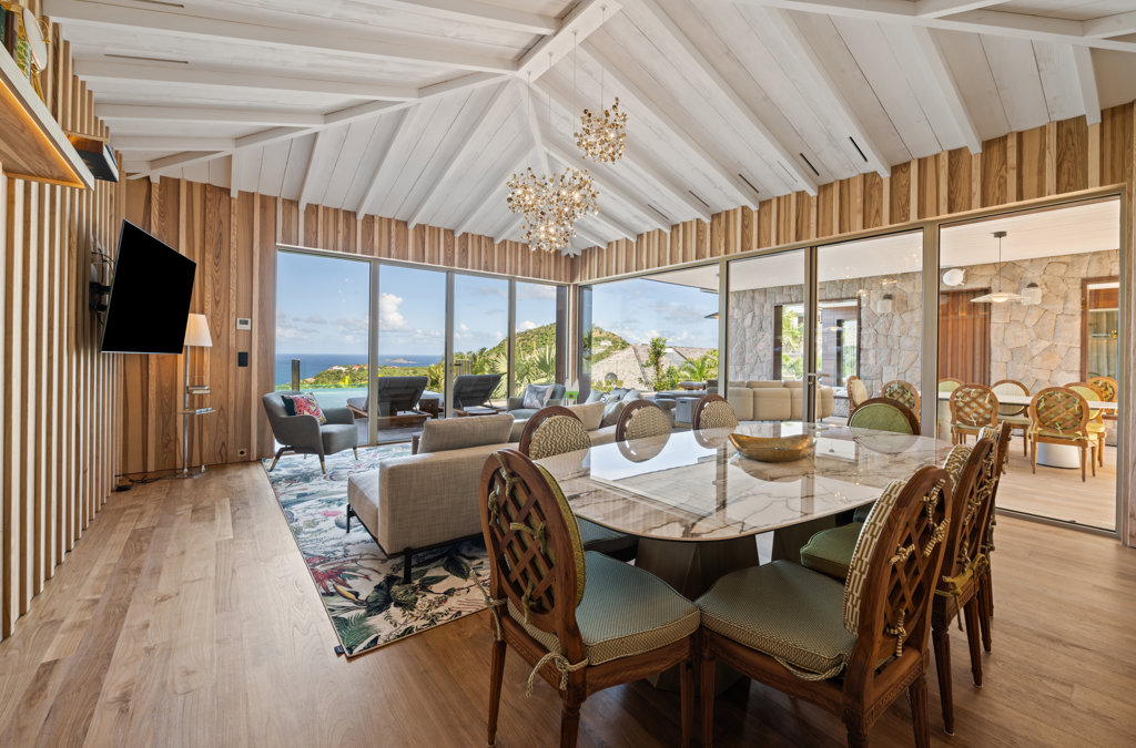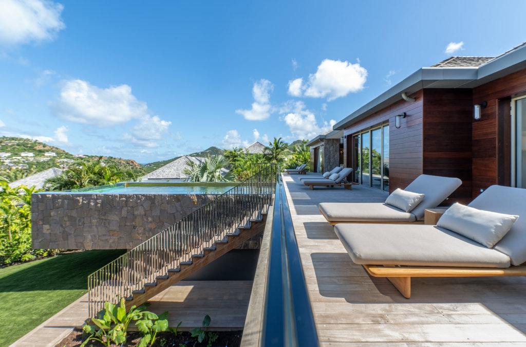 Overlooking the sparkling St Jean Bay, Villa Golden Eye is a stunning, fully air-conditioned home defined by its original design features and chef’s kitchen. Two spacious bedrooms and a kids' room on the main level offer privacy while the primary bedroom on the ground level opens onto its own private terrace with jacuzzi. The remarkable pool lined in mosaic tiles boasts a transparent side facing the sea for an elevated swimming experience.