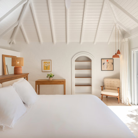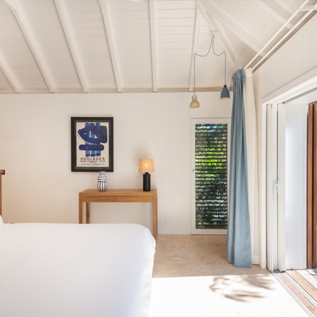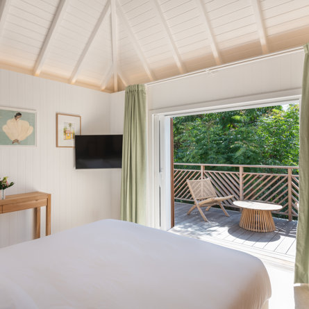Private terrace, Air conditioning, Queen size bed, Closet, Desk, Smart TV, Apple TV, Sound system, Curtains, Mosquito net, Safe.