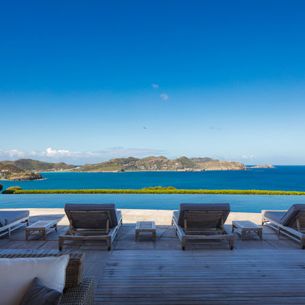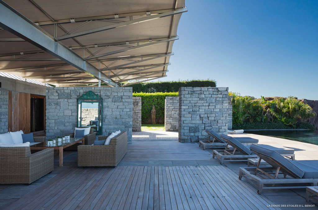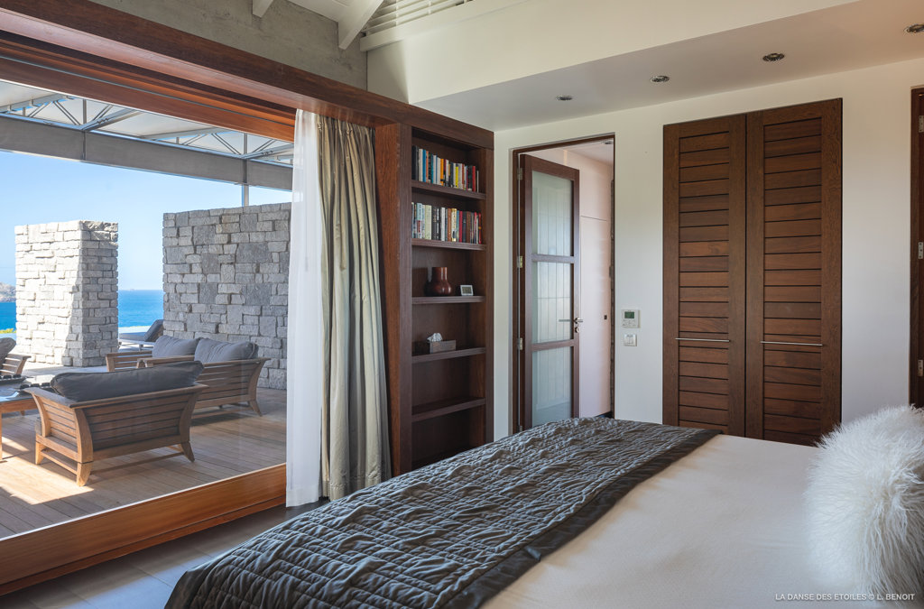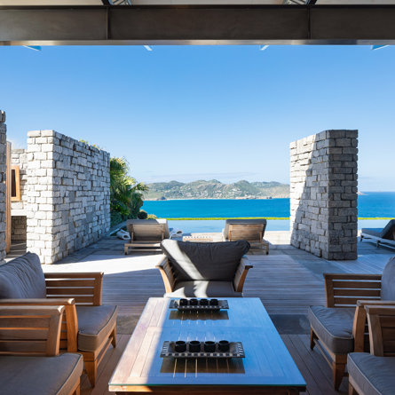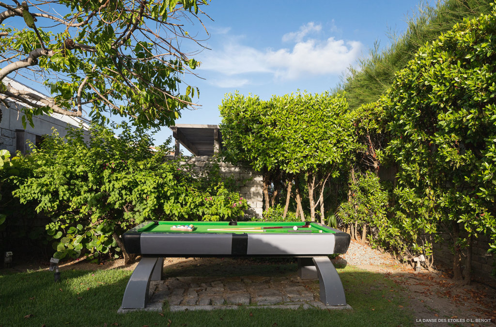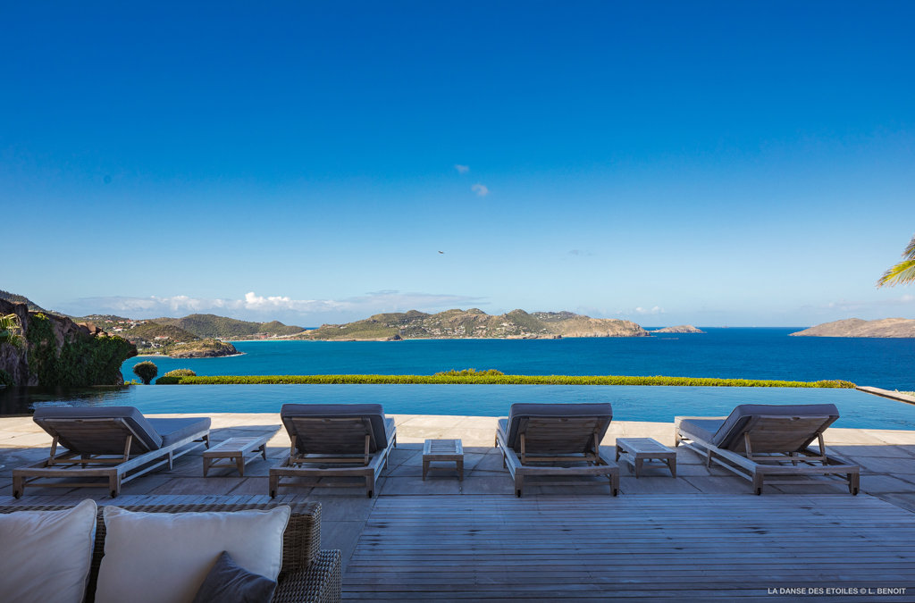 La Danse des Etoiles is a striking, air-conditioned villa with rich wood floors offering three main floor and two lower-level bedrooms for a family with teenagers or a group of friends, and featuring a massage room and fitness room, while the incredibly spacious outside area boasts a pool table and refined sundeck for a convivial gathering to watch the sunset over St Jean and Lorient thanks to this villa’s double viewpoints.