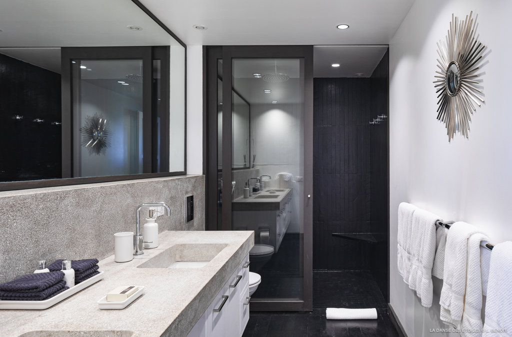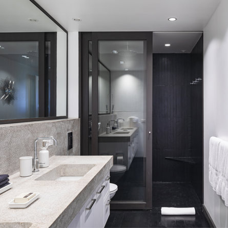 Ensuite bathroom, Shower, Two sinks, Hair dryer, Close toilet.