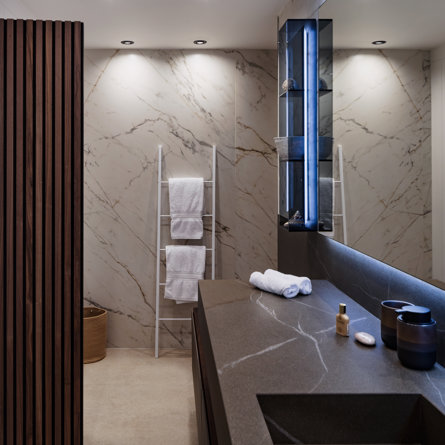 Ensuite bathroom, Walk-in shower, Sink, Open toilet.