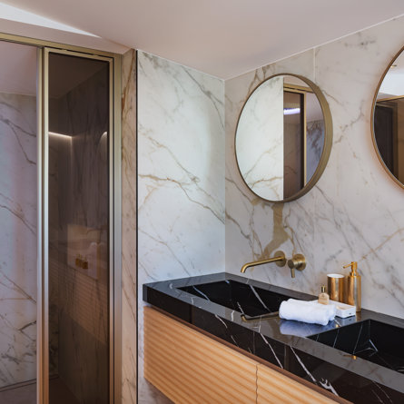 Ensuite bathroom, Walk-in shower, Two sinks, Open toilet.