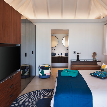 Sea view, Air conditioning, Fan, Queen size bed, Closet, Apple TV, Sound system, Safe.