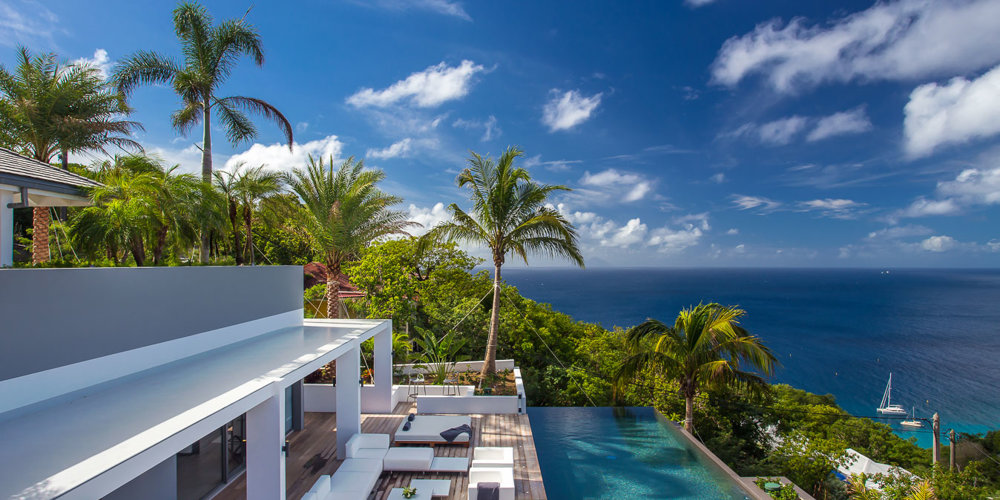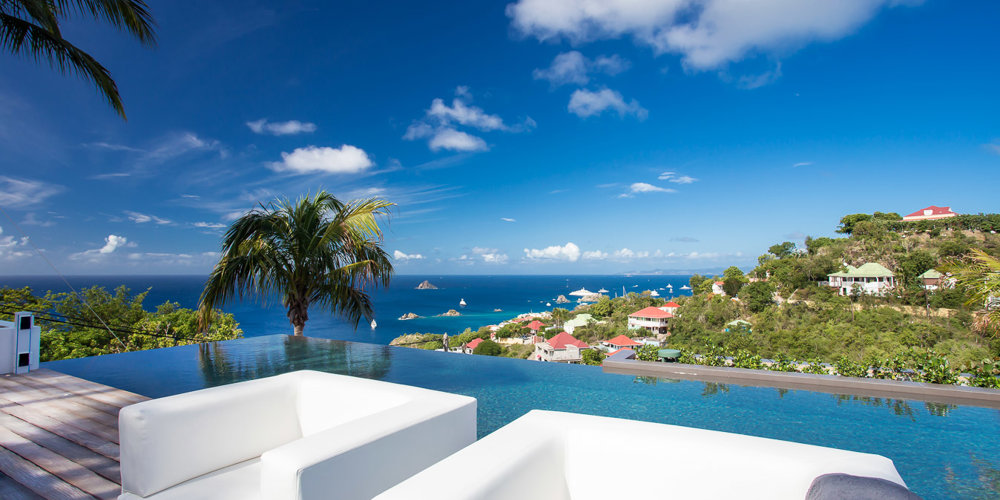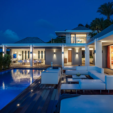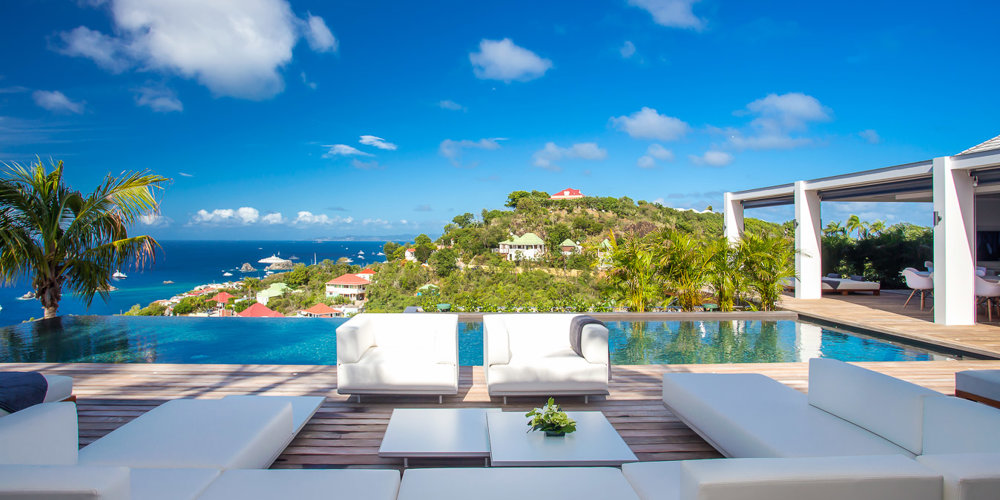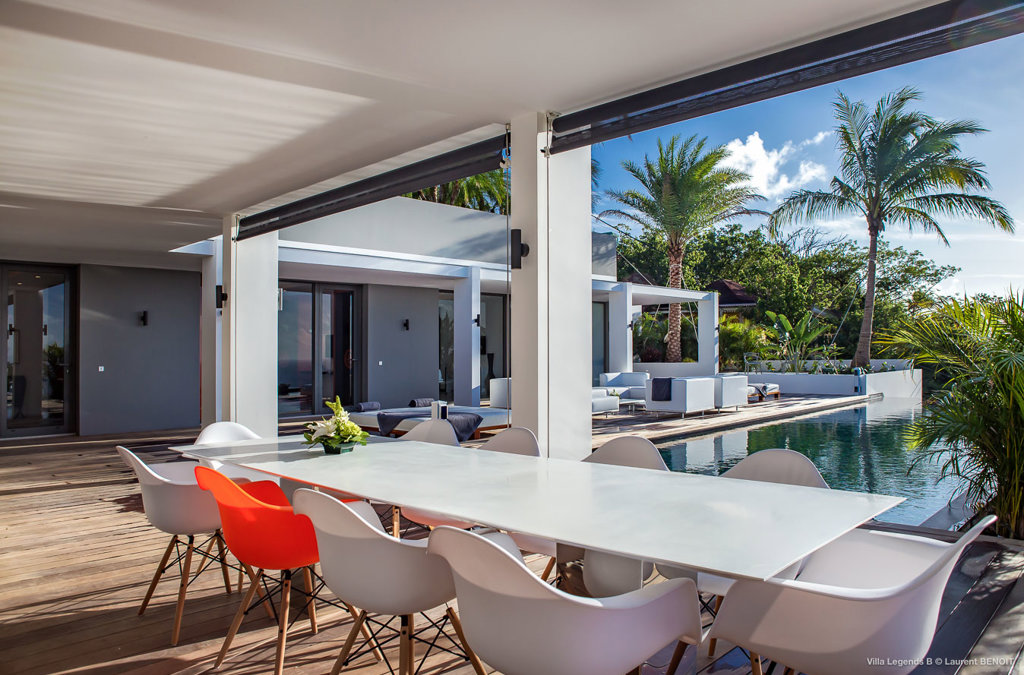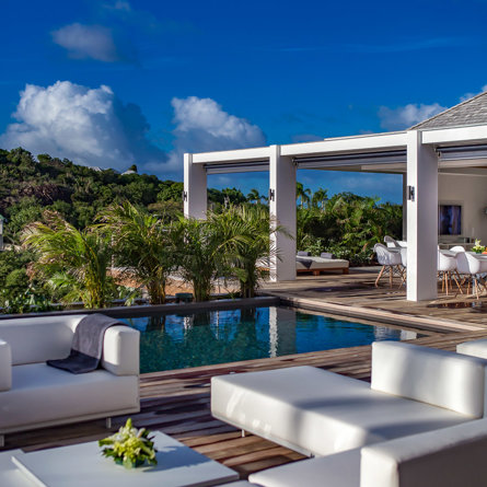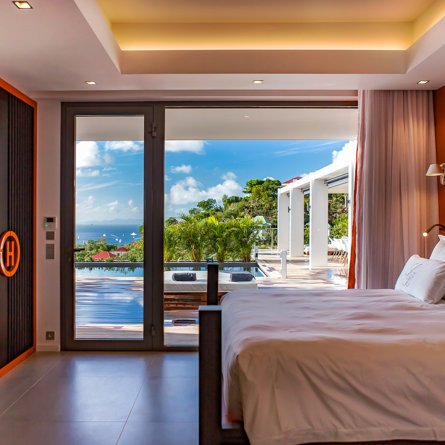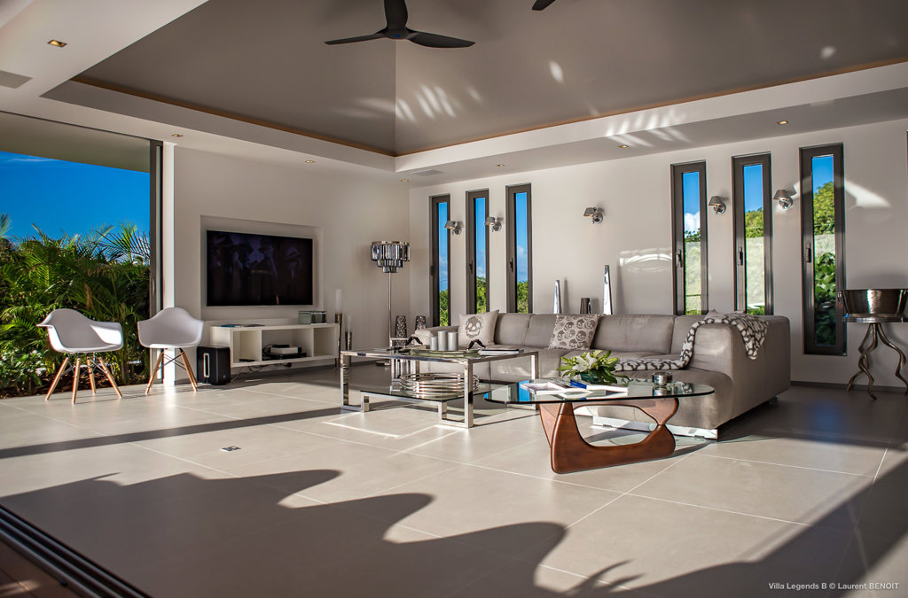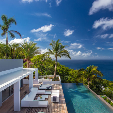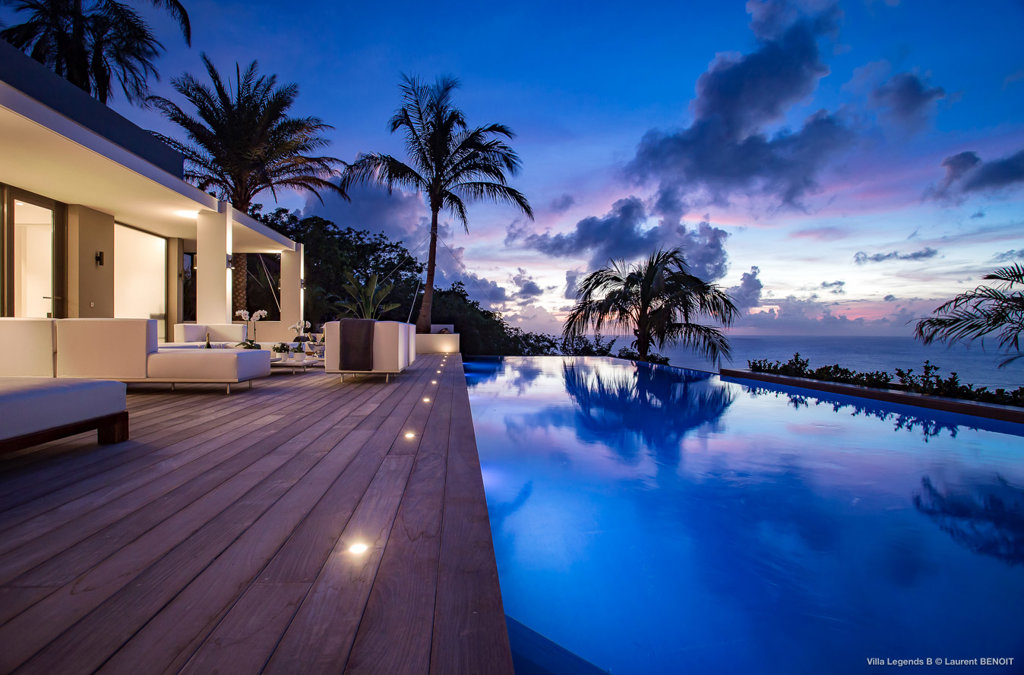 Fashion-forward friends will delight in the charming three-level Villa Legends B with its five designer themed bedrooms in modern décor to channel the glamour of Chanel, Vuitton, Hermes, Saint Laurent or Bulgari — this fully air-conditioned home features a fitness room and sunset views over Lurin and Gustavia.