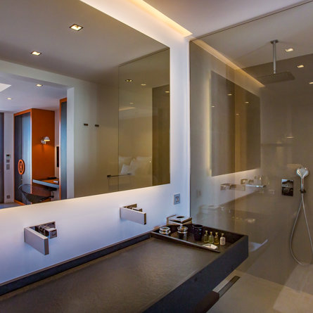 Ensuite bathroom, Walk-in shower, Sink, Hair dryer, Open toilet.