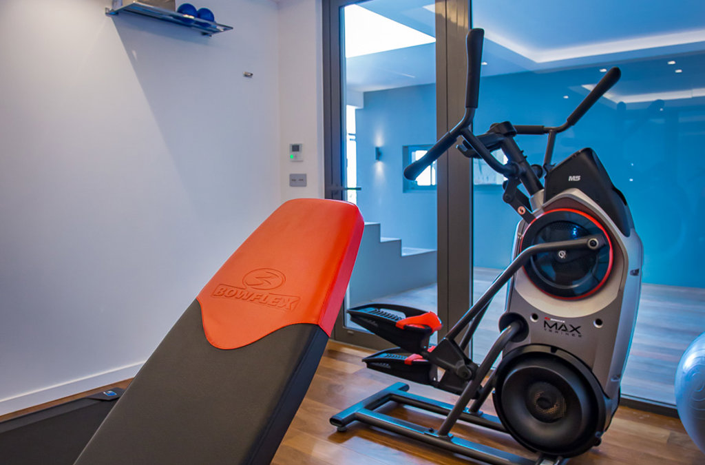 Air conditioning, Elliptical bike, Rowing machine, Weight bench, Weights, Yoga mats.