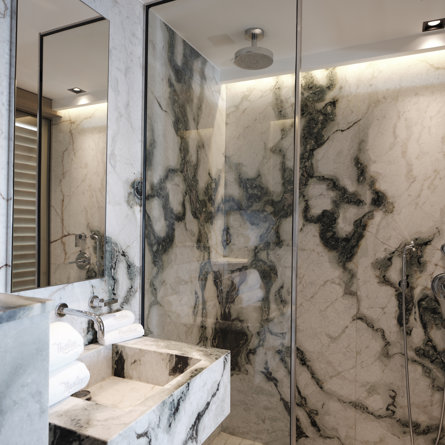 Ensuite bathroom, Walk-in shower, Sink, Open toilet.
