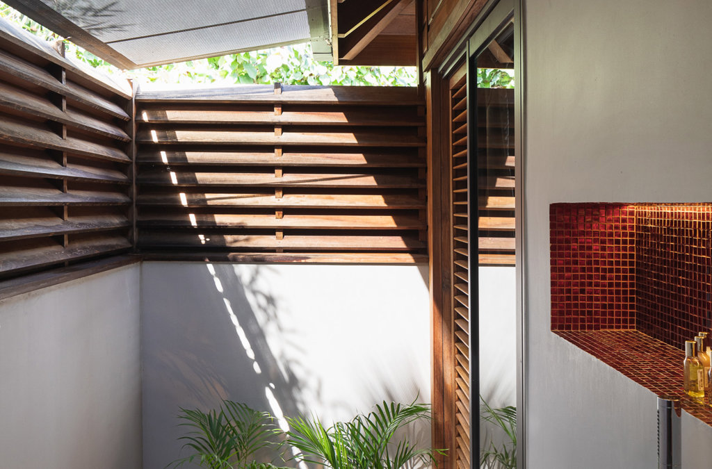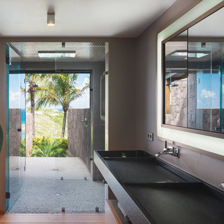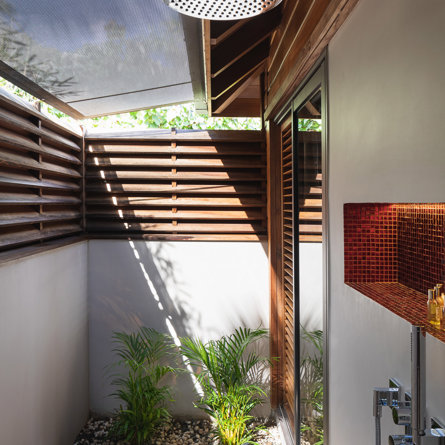 Ensuite bathroom, Outside shower, Two sinks, Open toilet.