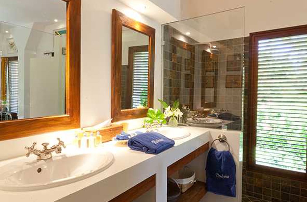 Ensuite bathroom, Shower, Two sinks, Hair dryer, Open toilet.