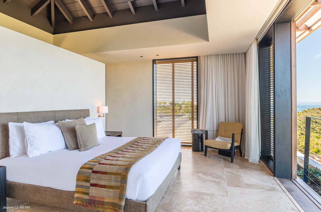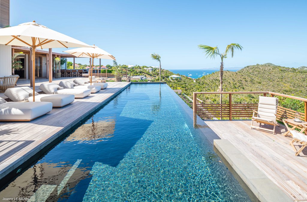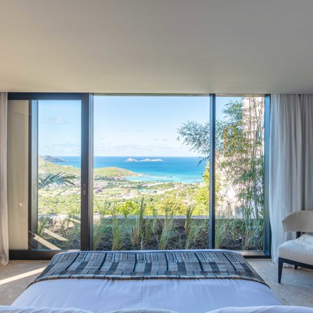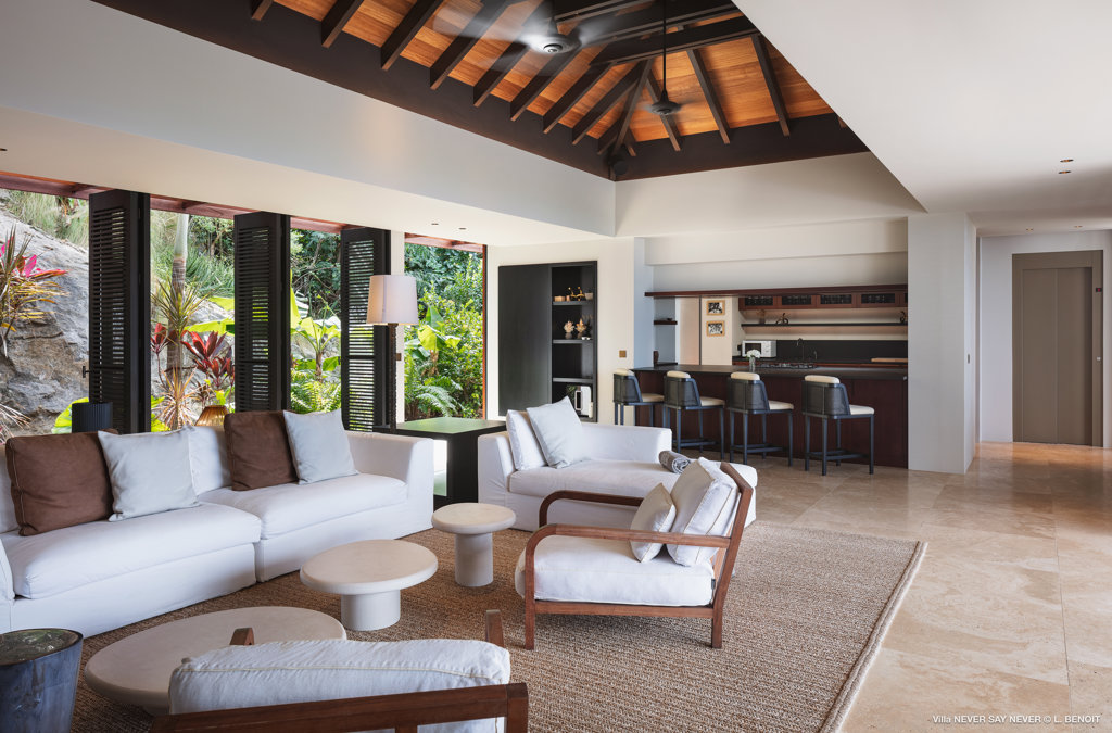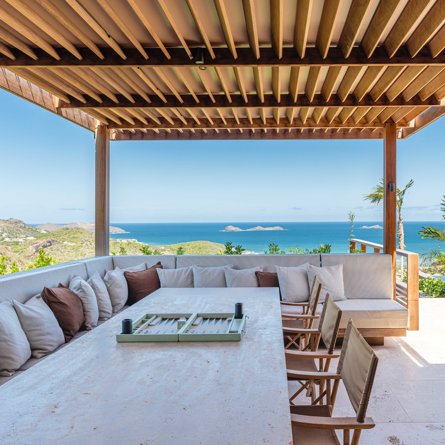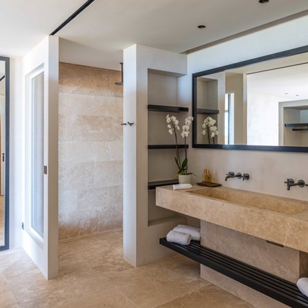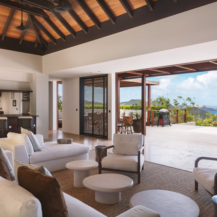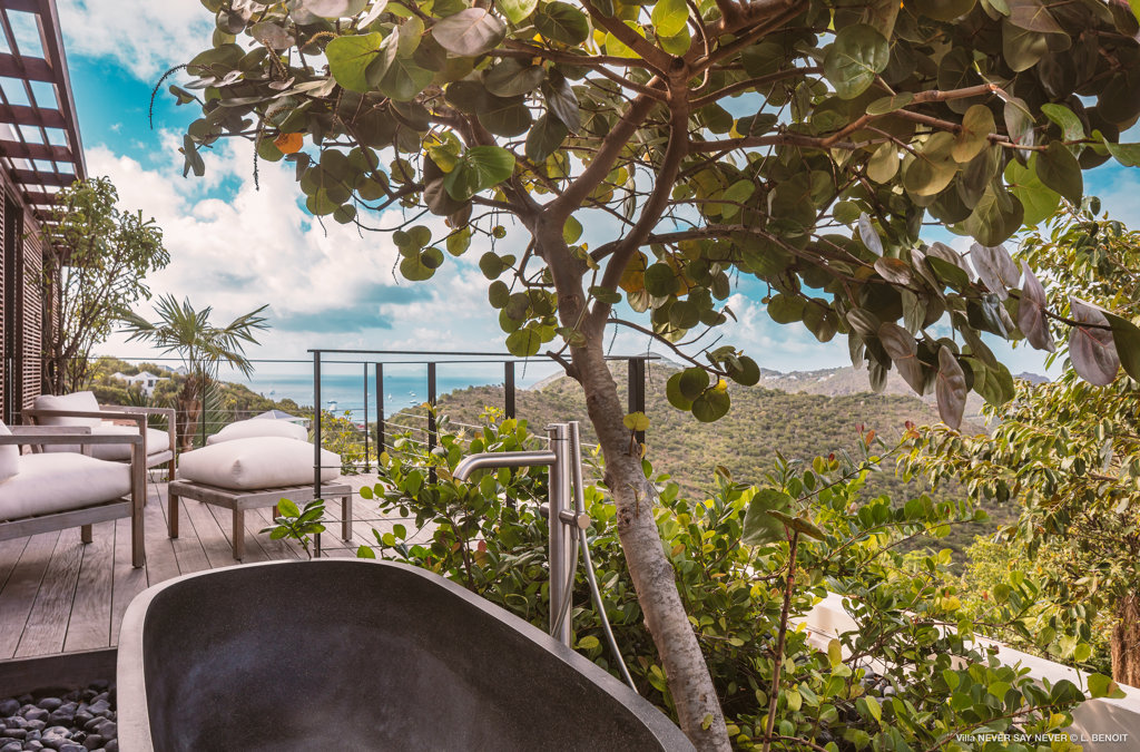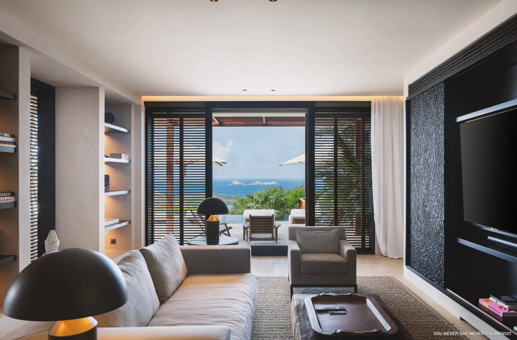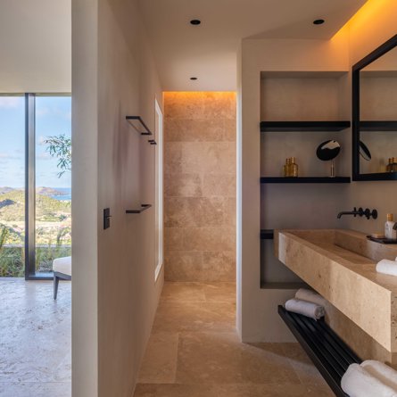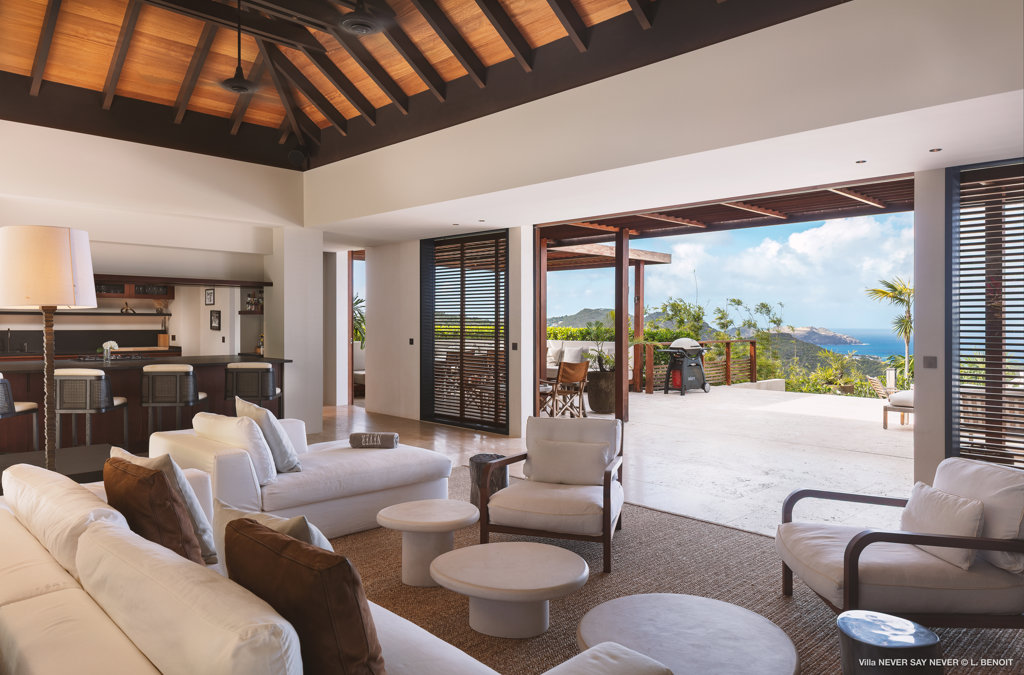 Well-situated in Lurin but also close to Gustavia, Villa Never Say Never is a jaw-dropping home thanks to unique travertine stone furniture and a very open layout that offers birds-eye views over St Jean and partial views of Gustavia, featuring a TV room as a comfortable gathering spot for friends and family, and four equal-size bedrooms spread over three levels.