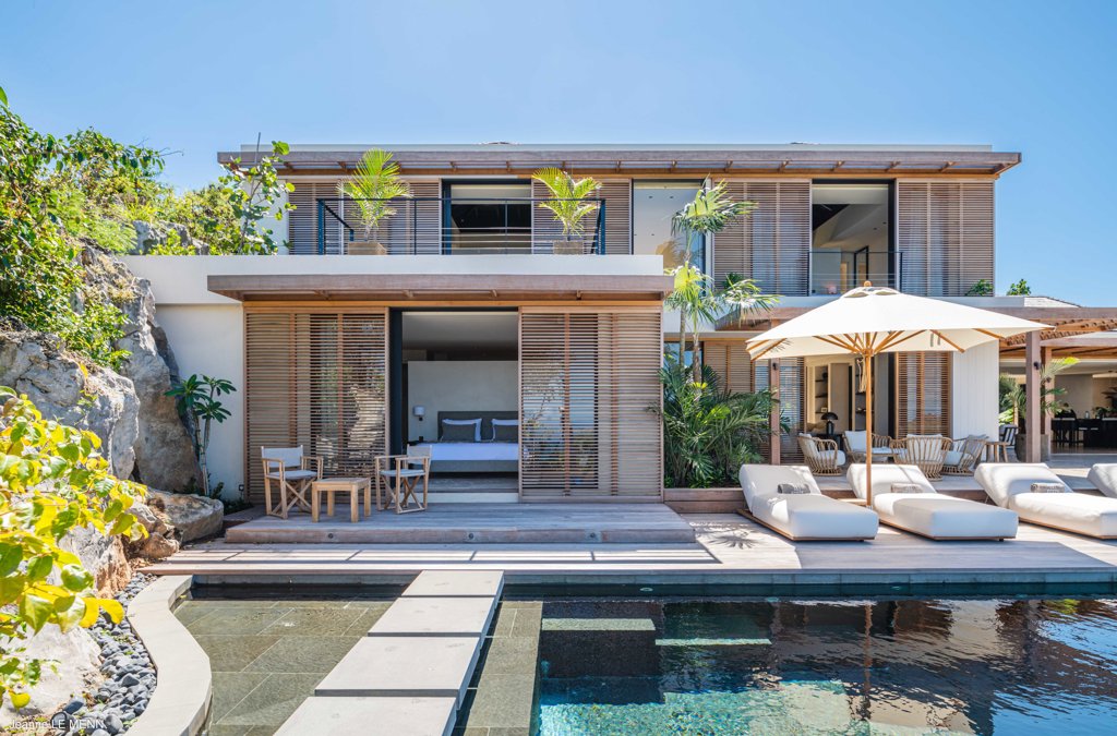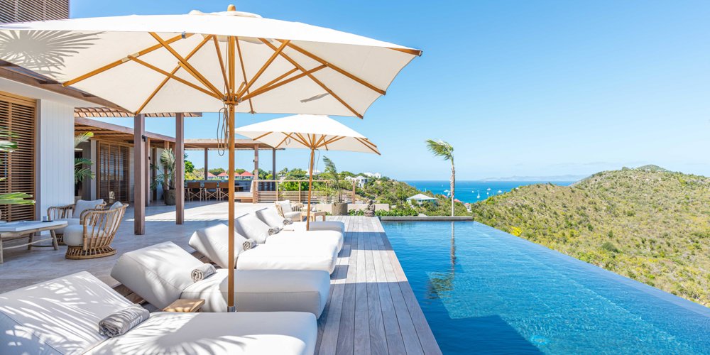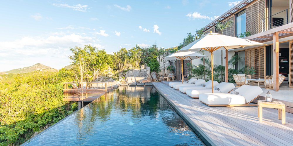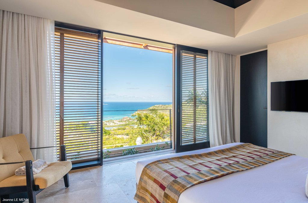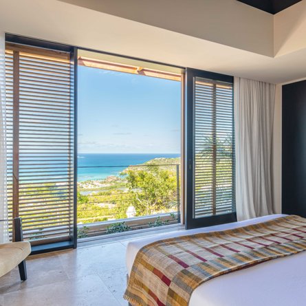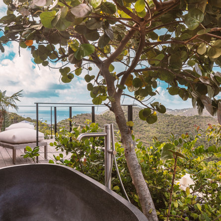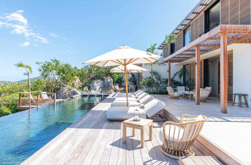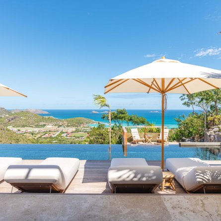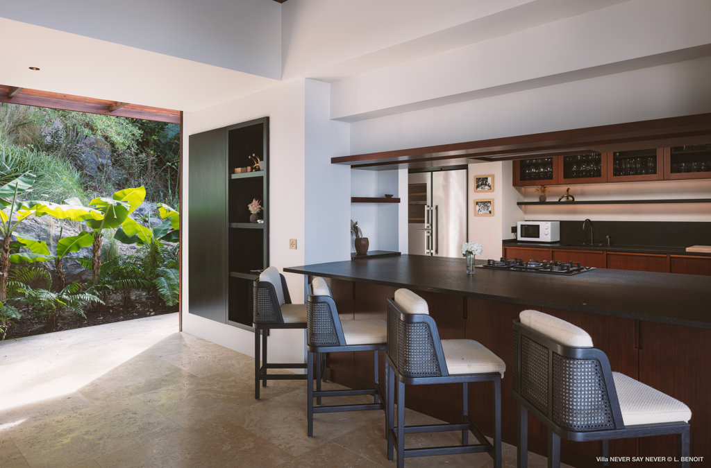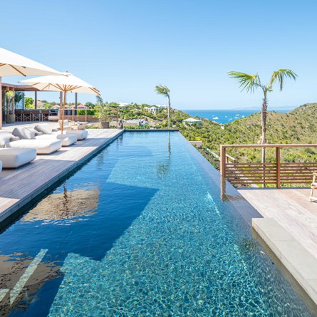 Well-situated in Lurin but also close to Gustavia, Villa Never Say Never is a jaw-dropping home thanks to unique travertine stone furniture and a very open layout that offers birds-eye views over St Jean and partial views of Gustavia, featuring a TV room as a comfortable gathering spot for friends and family, and four equal-size bedrooms spread over three levels.