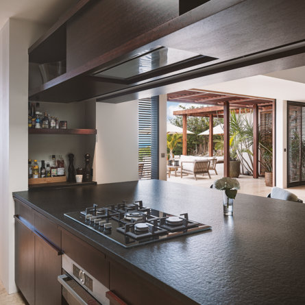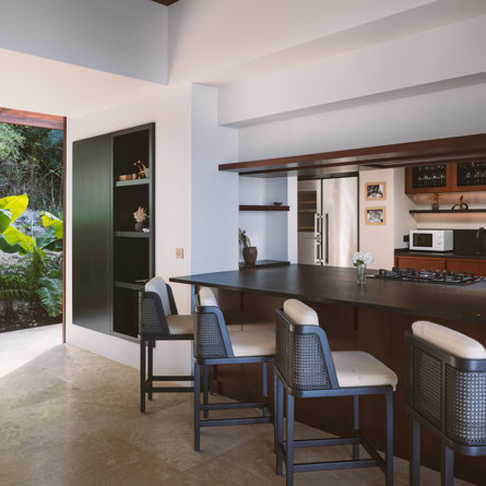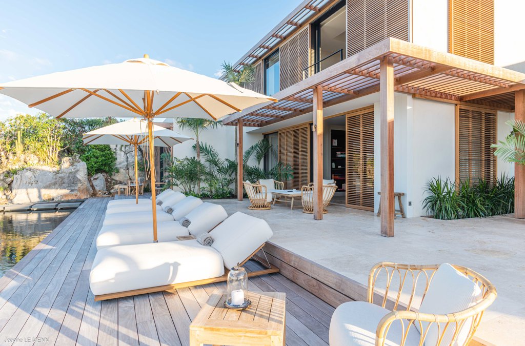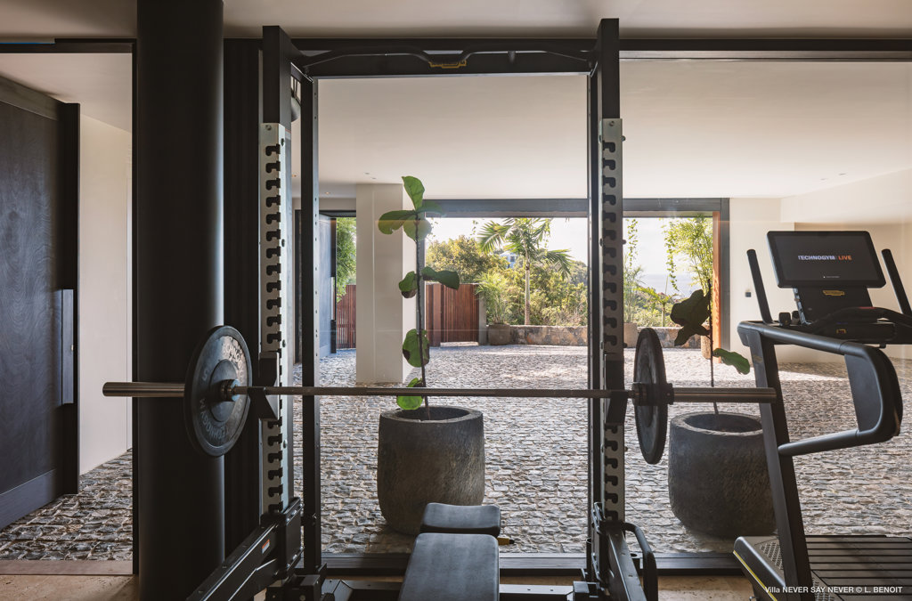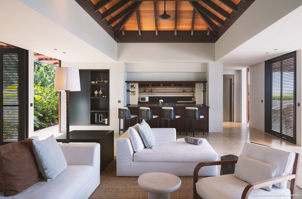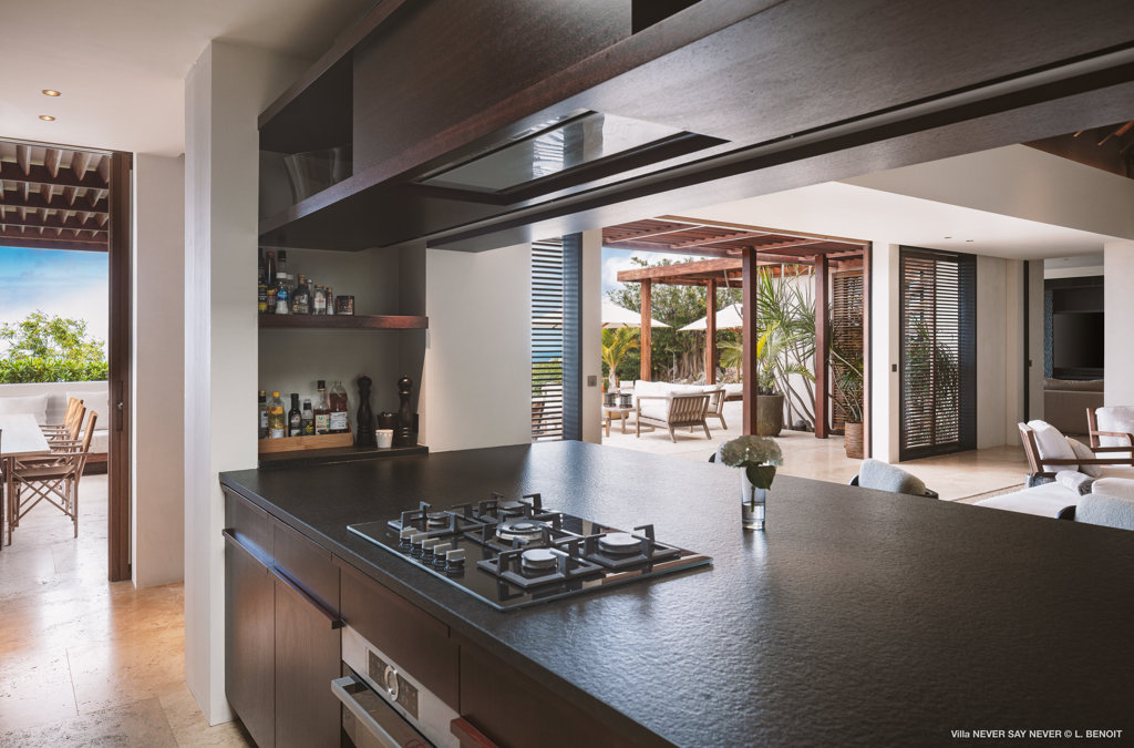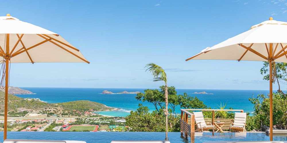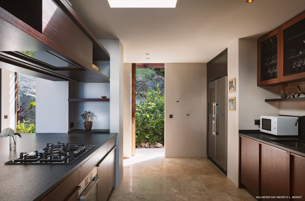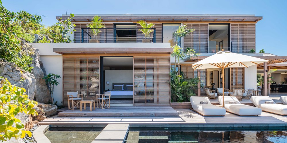 Well-situated in Lurin but also close to Gustavia, Villa Never Say Never is a jaw-dropping home thanks to unique travertine stone furniture and a very open layout that offers birds-eye views over St Jean and partial views of Gustavia, featuring a TV room as a comfortable gathering spot for friends and family, and four equal-size bedrooms spread over three levels.